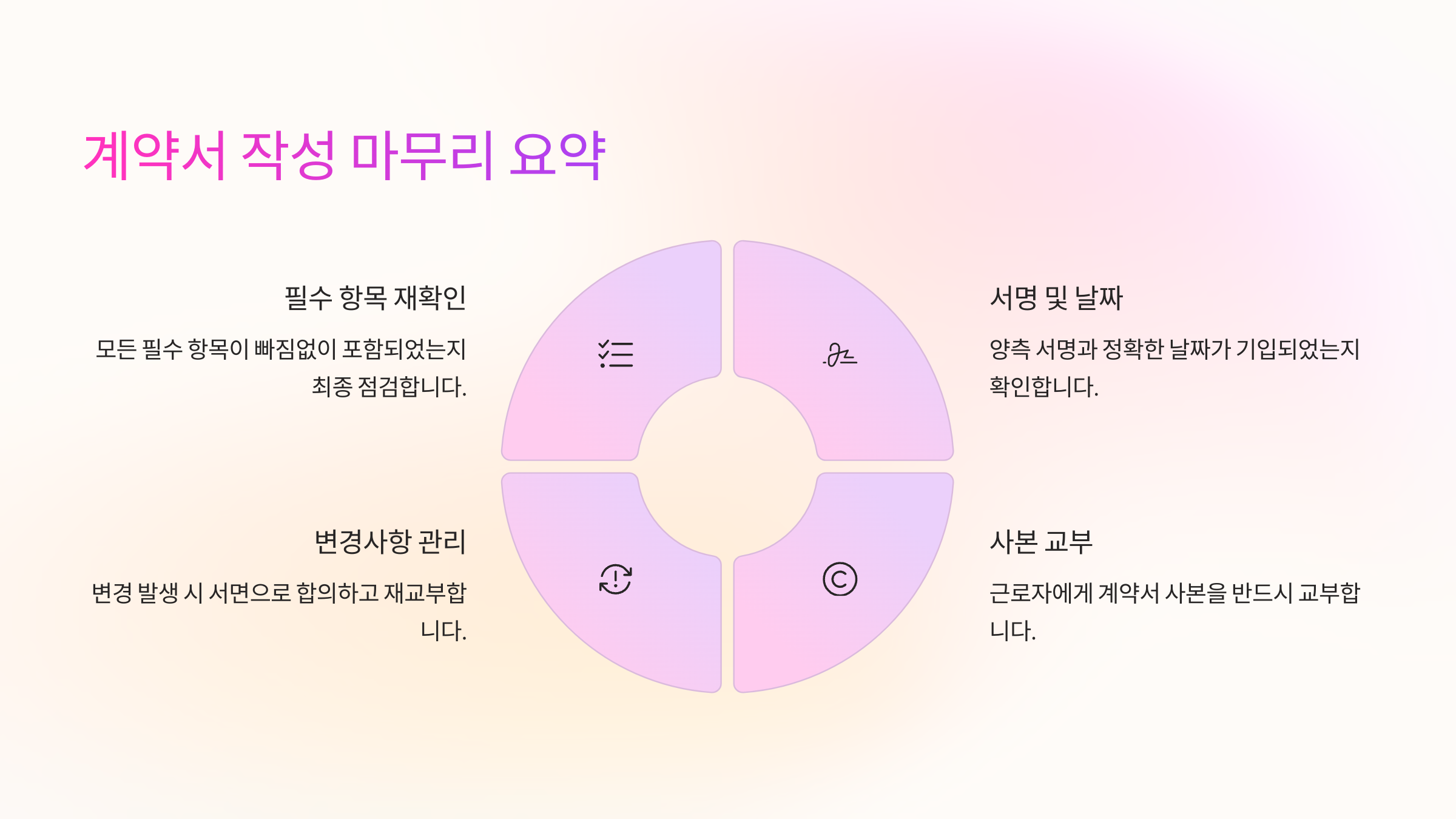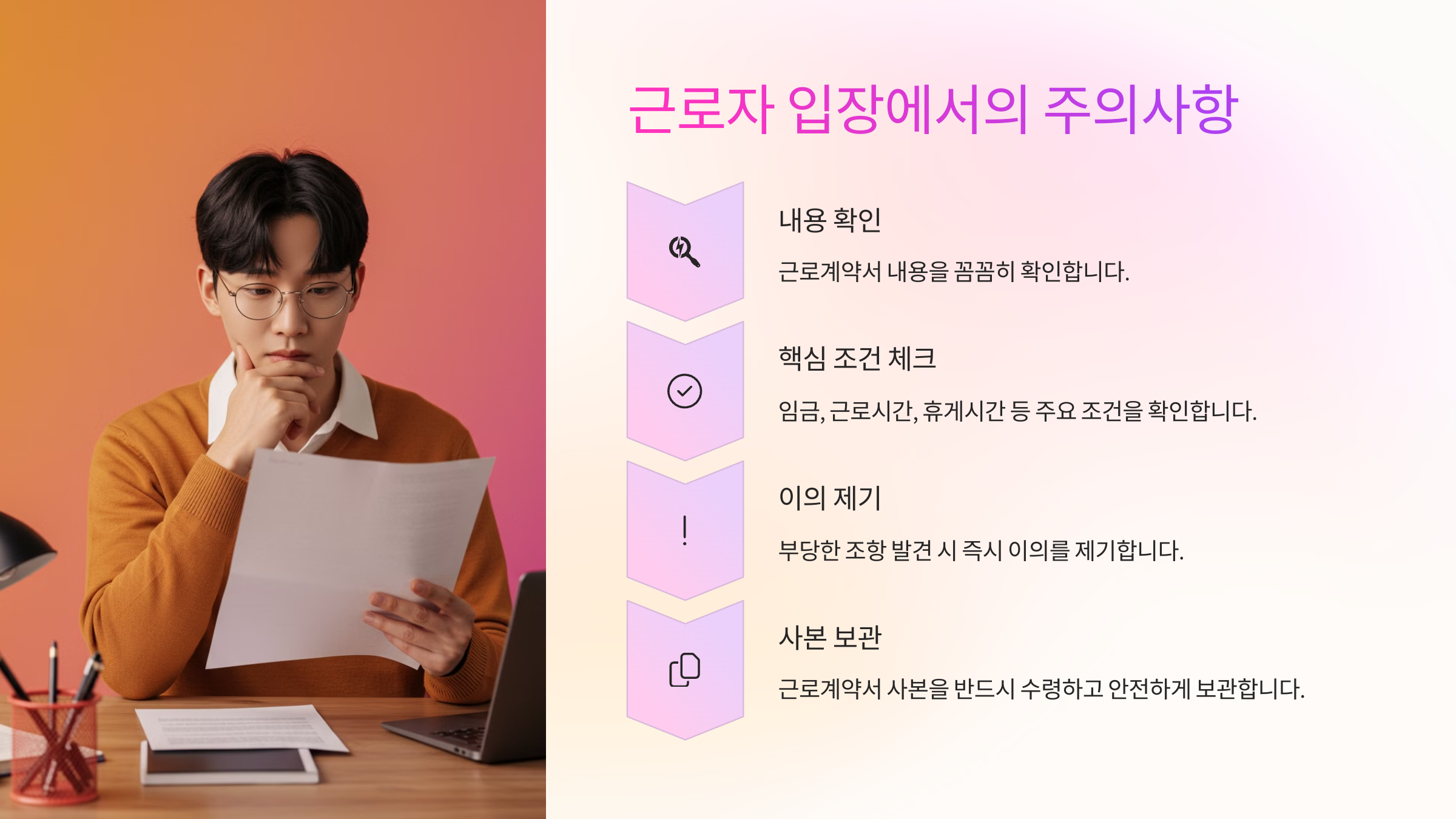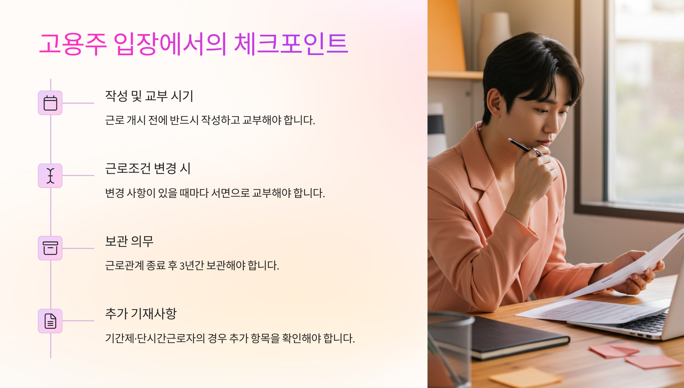 또 하나 중요한 건, 계약서 작성 전과 후에 근로자에게 충분한 설명을 제공하는 거예요. 특히 고용주는 근로자가 이해할 수 있도록 용어를 쉽게 풀어 설명해 줄 의무가 있어요. “알아서 보세요”는 법적으로 인정되지 않아요!