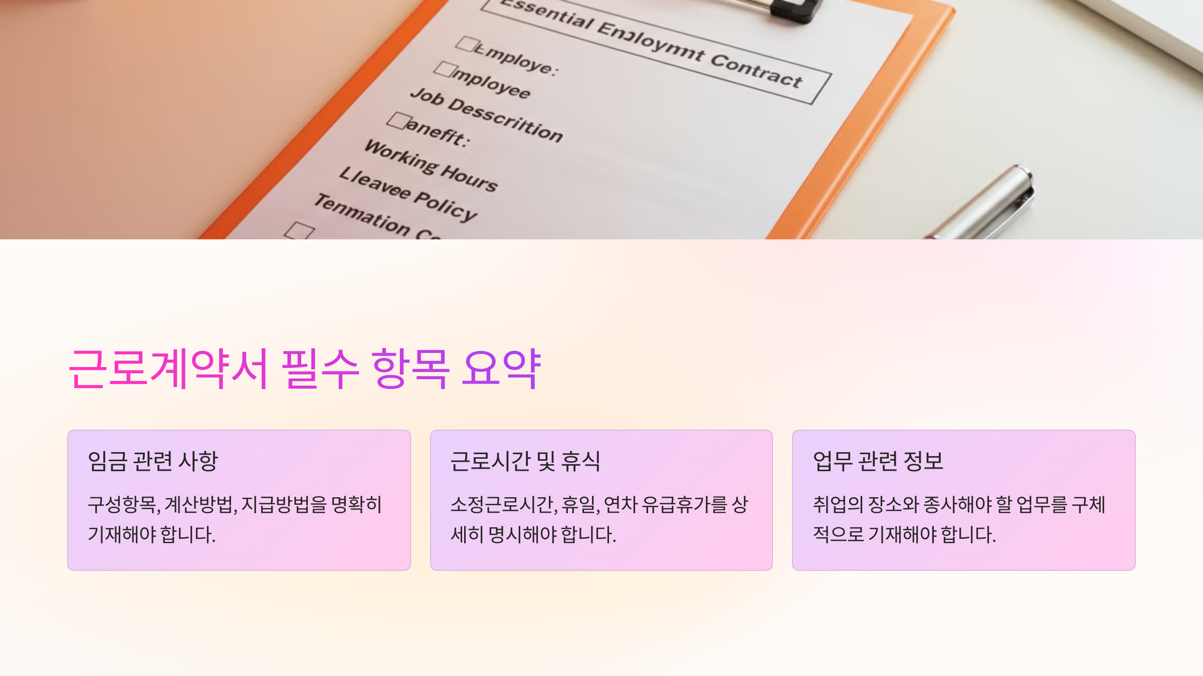 근로계약서는 단순히 이름과 날짜만 적는 문서가 아니에요. 반드시 명시해야 하는 법정 필수 항목들이 있어요. 이걸 누락하면 계약 자체가 무효가 될 수도 있고, 나중에 법적 분쟁에서 매우 불리해질 수 있어요.