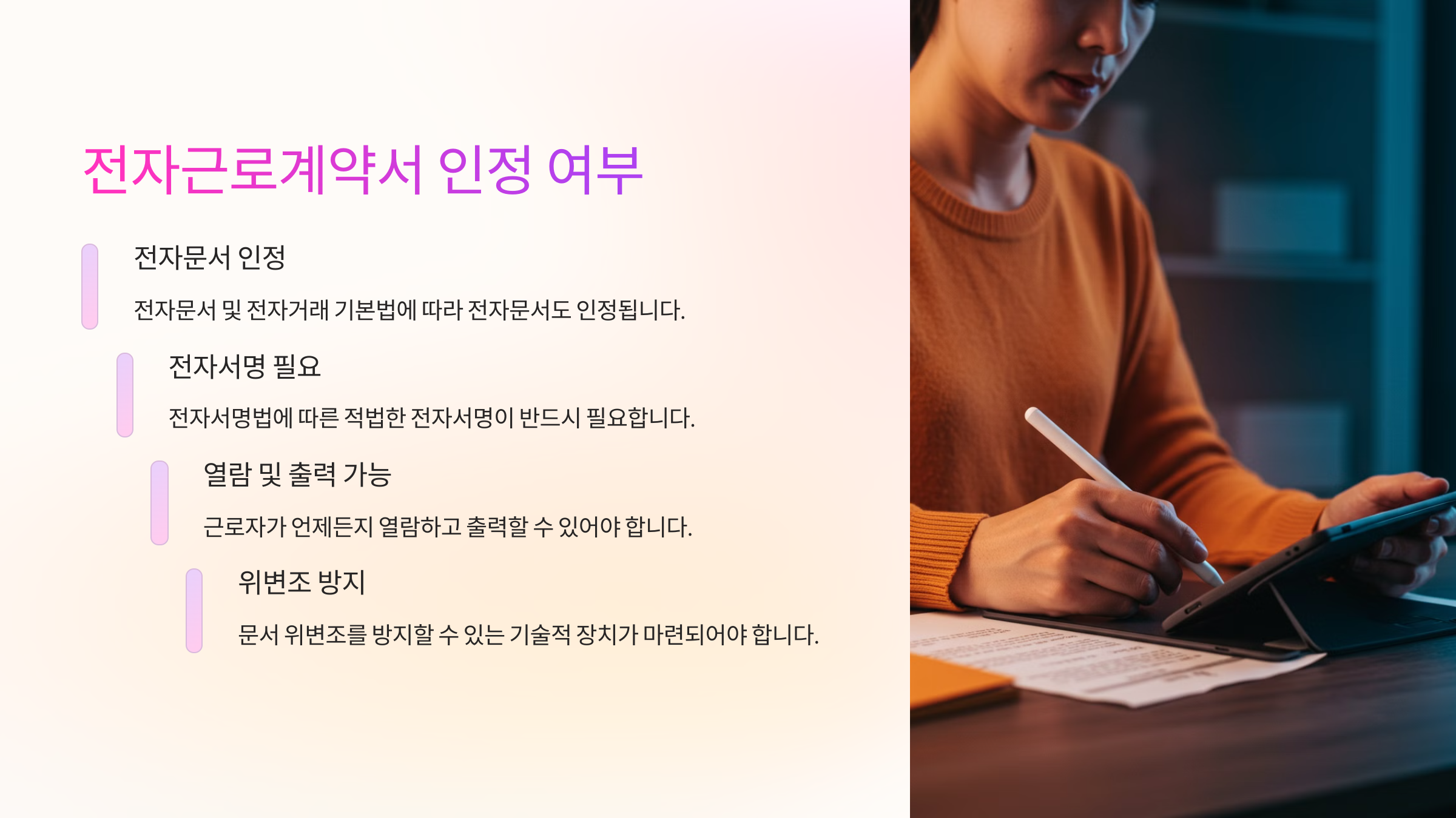 2021년부터 고용노동부는 전자근로계약서를 명확히 '법적 효력이 있음'으로 인정하고 있어요. 즉, 스마트폰이나 PC를 통해 계약서를 작성하고 전자서명만 해도 법적 구속력이 발생한다는 뜻이에요.