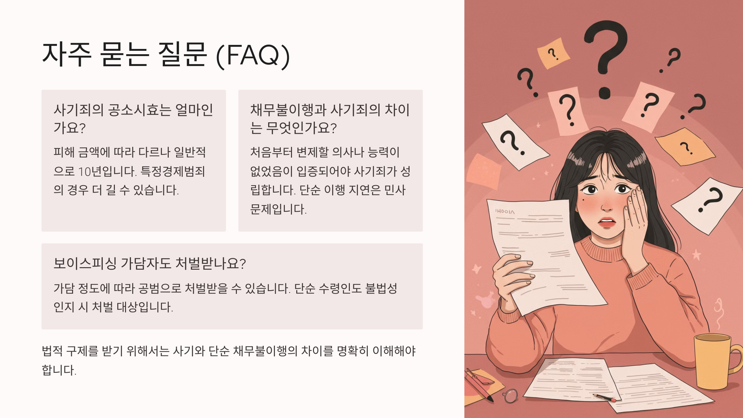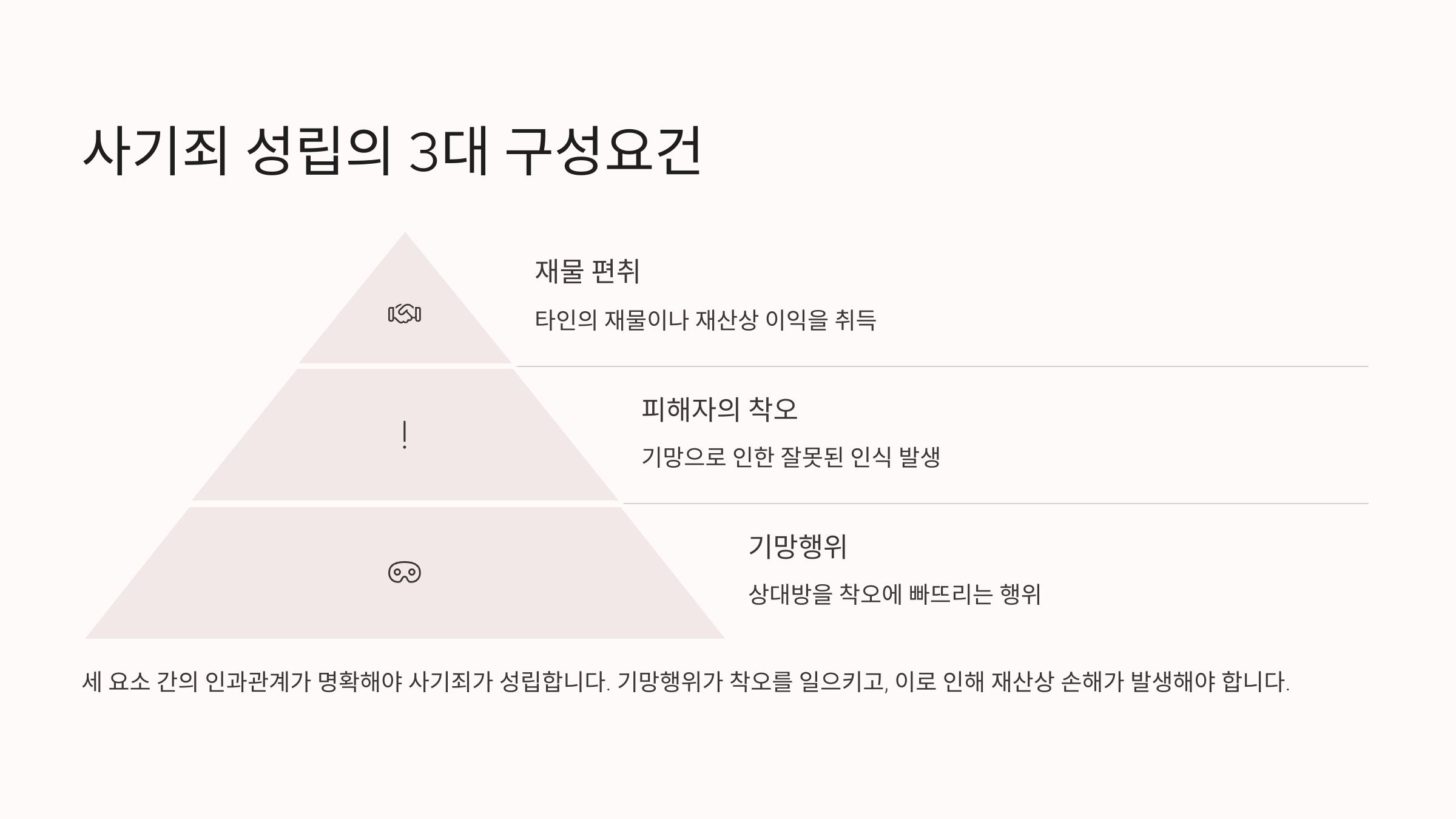 이 세 가지가 함께 충족돼야만 비로소 형법상 사기죄로 판단돼요. 하나라도 부족하면 형사처벌 대상이 되지 않을 수 있어서, 실제로 사기죄는 입증하기 어려운 범죄 중 하나로 꼽혀요.