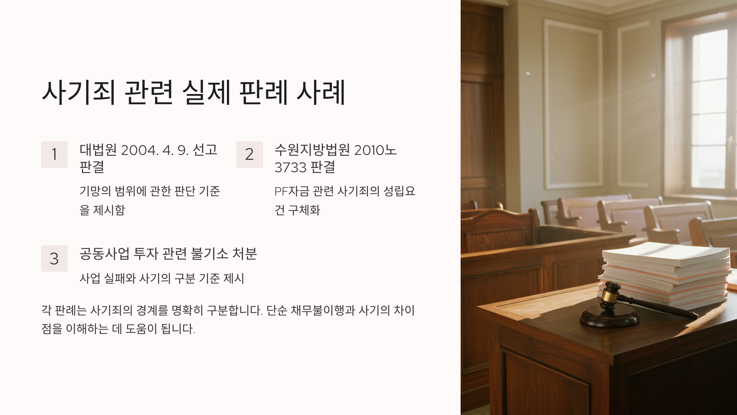 이런 식으로 판례에 따라 사기죄가 성립되는 조건이 얼마나 엄격하게 판단되는지 알 수 있어요. 실제 재판에서는 '속이려는 의도'와 '피해자의 신뢰도'까지도 검토하니까, 한 끗 차이로도 결과가 달라질 수 있어요.