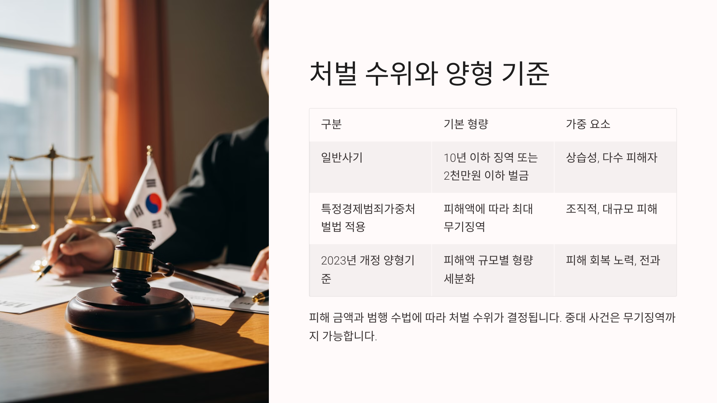양형 기준은 대법원 양형위원회에서 정해놓은 가이드라인에 따라 어느 정도 일관되게 운영돼요. 예를 들어, 1억 이상 피해 시 기본적으로 실형이 원칙이고, 5천만 원 이하 피해는 상황에 따라 벌금형이나 집행유예가 고려돼요.