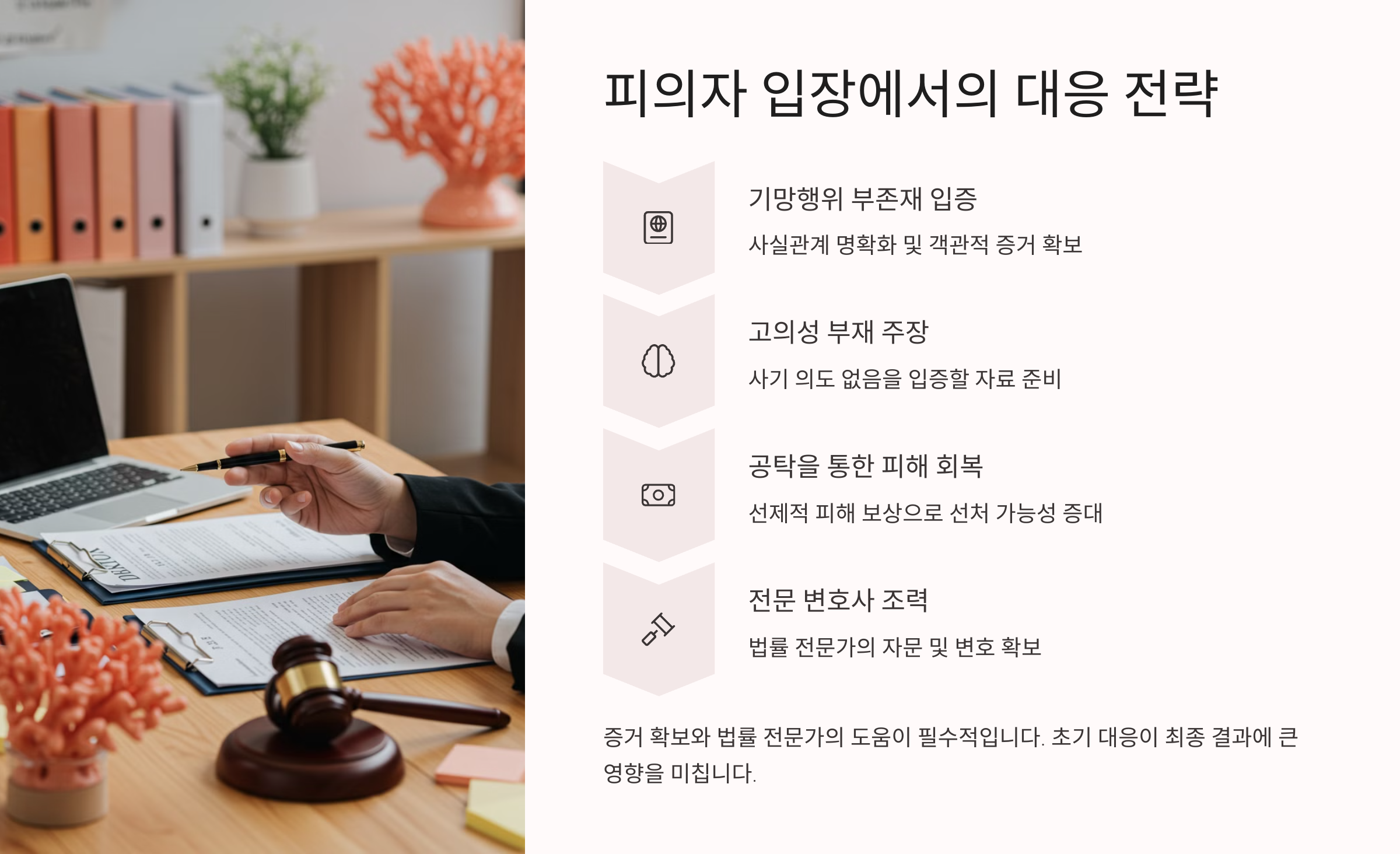 | 기망행위 | 상대방을 속이는 거짓 행동 또는 진실 은폐 | 고의성 입증 필요 |