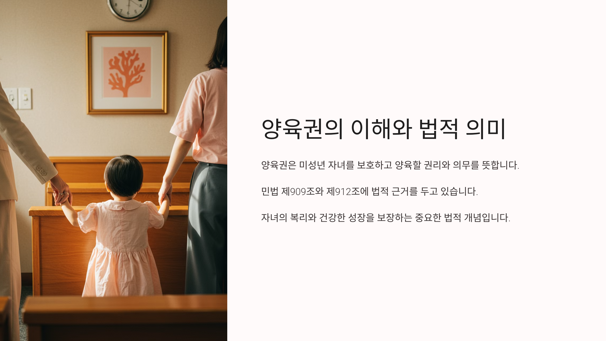 양육권은 부모 중 누구에게 아이를 직접 양육하고 보호할 권리와 책임이 있는지를 정하는 법적 개념이에요. 단순히 누가 아이를 데리고 살 것인지 이상의 의미를 가지고 있죠. 법원은 아이의 복리와 안정적인 환경을 기준으로 양육권자를 정해요.