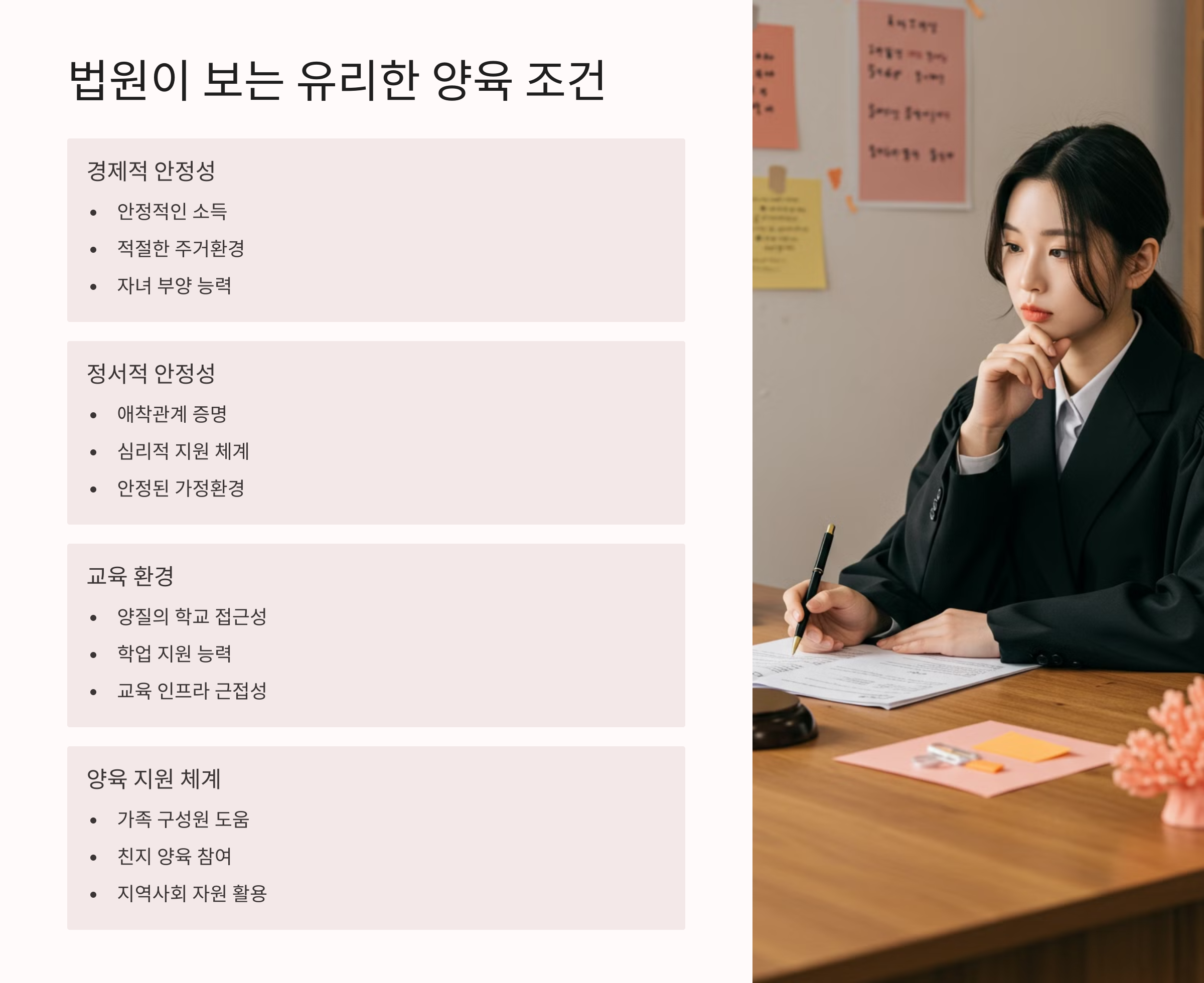 또한, 양육권은 아이의 나이, 성별, 성향 등도 함께 고려해서 결정돼요. 유아기에는 주 양육자였던 부모에게 주는 경우가 많지만, 초등학생 이후부터는 학교, 친구관계 등 외부 환경도 중요해진답니다.