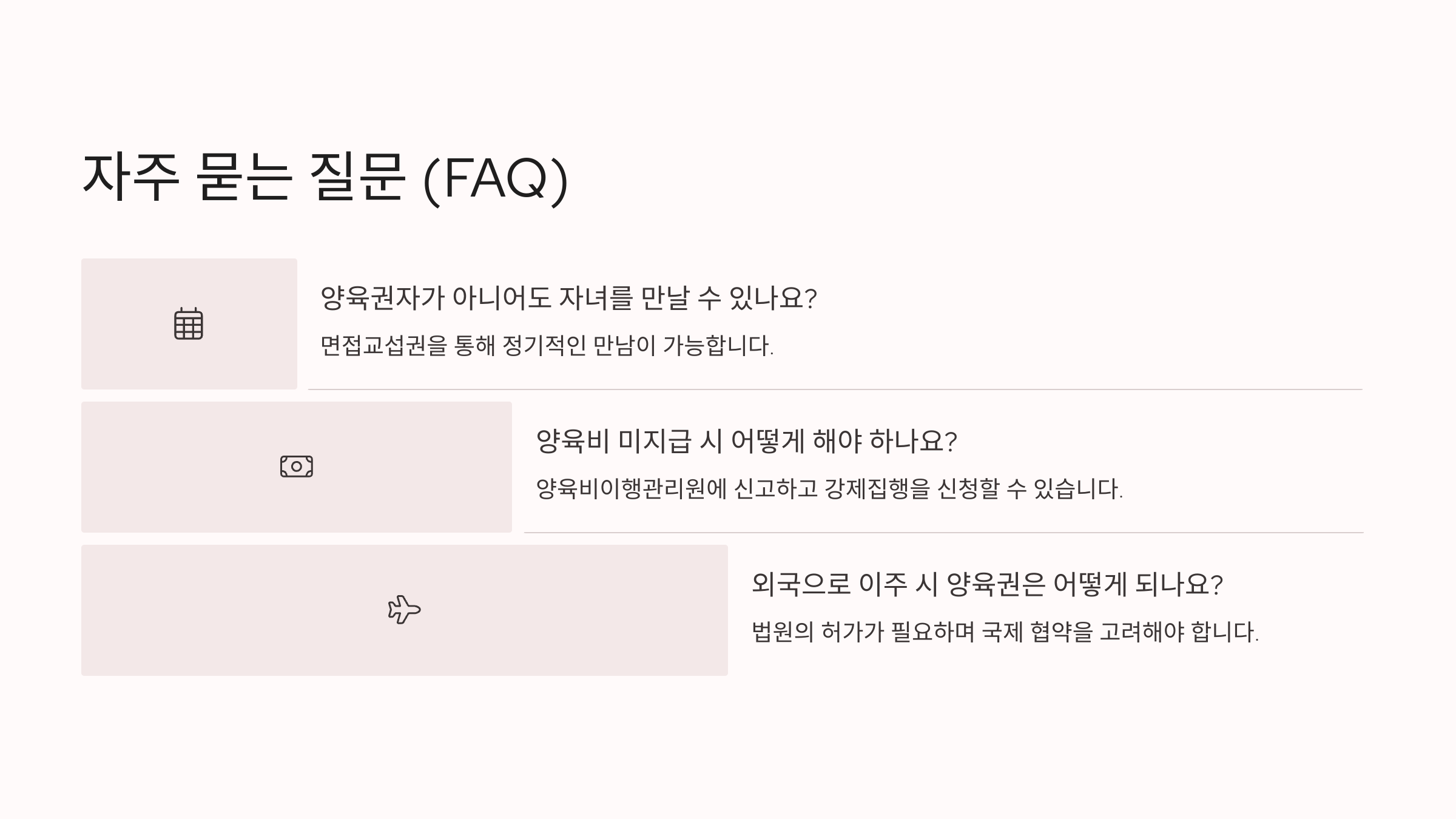 이해하기 쉽게 말하자면, 친권은 ‘행정적 권한’, 양육권은 ‘실생활의 주도권’이라고 보면 돼요. 양육권이 없는 부모는 일정한 조건 하에 면접교섭권을 가지게 되는데, 이 부분도 분쟁이 자주 생기는 영역 중 하나예요.