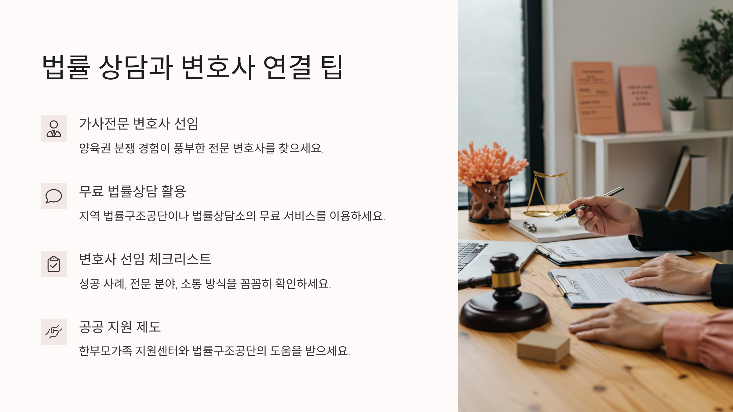 상담 전에 미리 정리된 문서들—혼인관계증명서, 자녀의 학교 생활기록부, 건강보험료 납입내역, 주거환경 사진 등—을 가져가면 변호사도 방향을 쉽게 잡아줄 수 있어요. 준비가 곧 전략이에요.