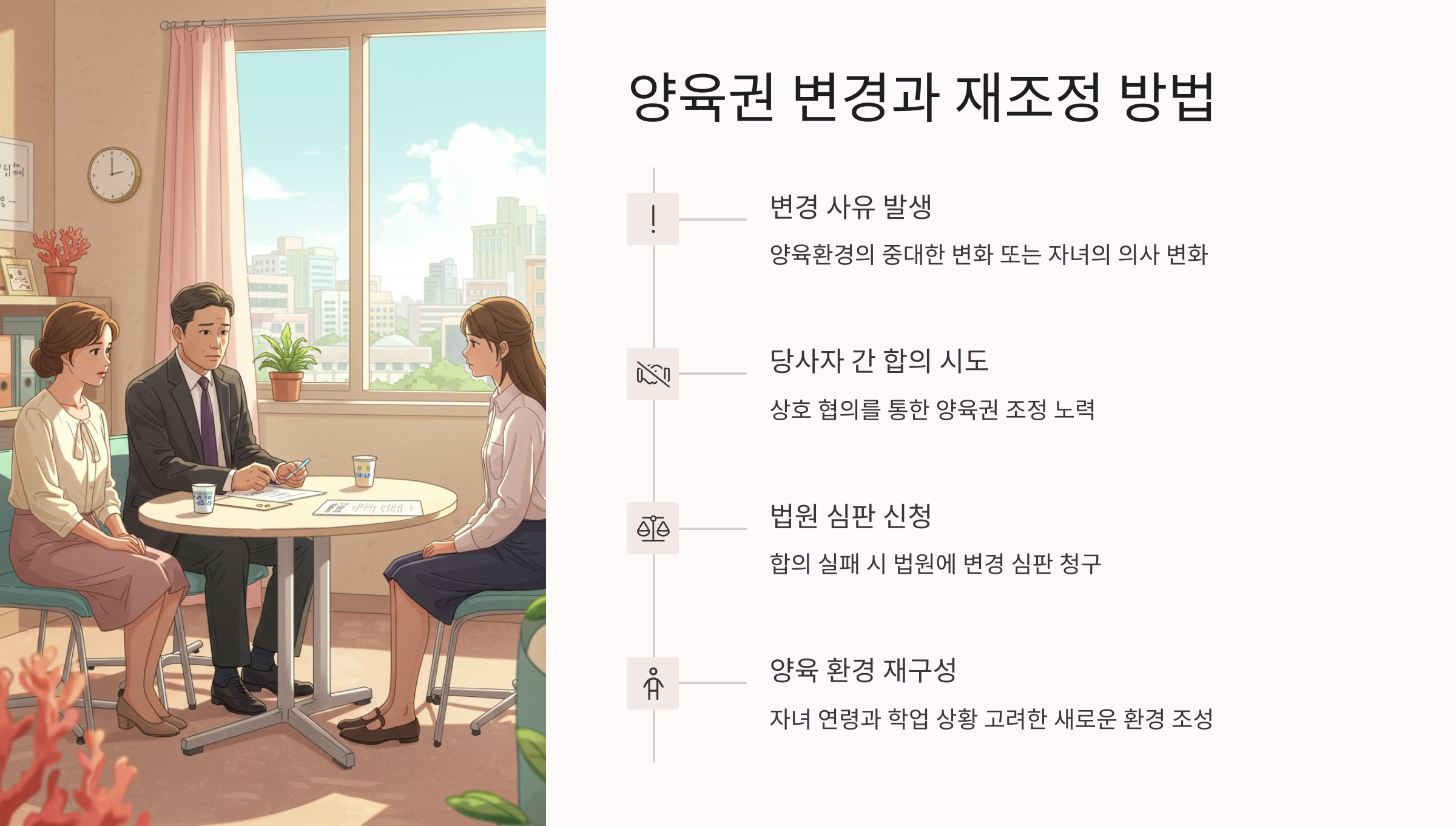 양육권은 한번 정해졌다고 해서 영원히 유지되는 건 아니에요. 부모의 상황이 바뀌거나, 아이의 복리 보호에 변화가 필요하다고 판단되면 법원에 양육권 변경 신청을 할 수 있어요. 이걸 ‘양육권 재조정’이라고 해요.