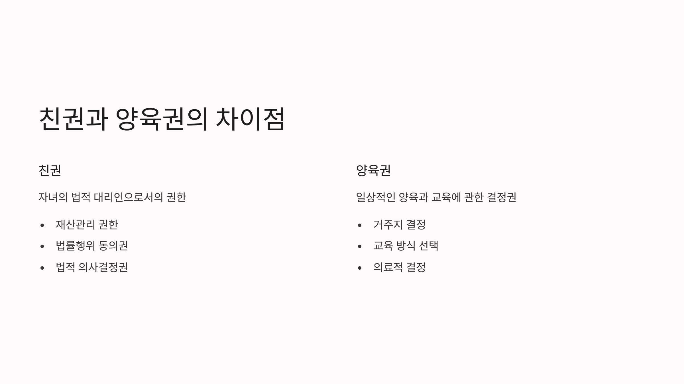 법원은 일반적으로 공동친권을 인정하지만, 실제 양육은 한쪽 부모에게 집중되므로 ‘양육권’ 쟁점이 더 민감하고 현실적인 문제가 돼요. 특히, 아이의 교육, 건강, 생활환경에 직접 영향을 주는 권한이라서 더 중요하게 다뤄지는 거죠.