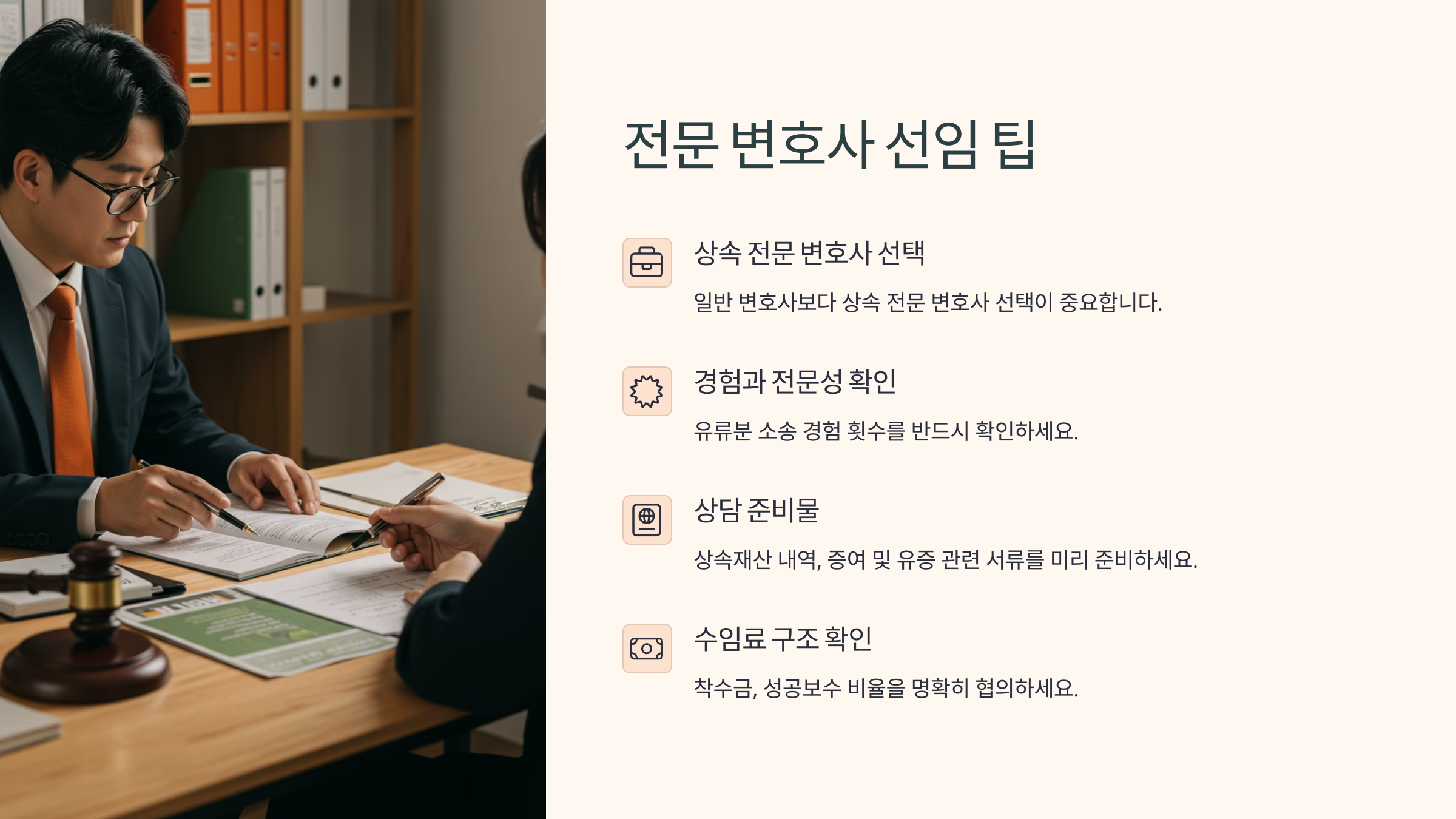 유류분 반환 청구는 전문 분야이기 때문에, 일반 민사 변호사보다 상속 사건 경험이 많은 변호사를 찾는 게 유리해요. 단순히 비용이 저렴하다고 선택했다가 패소하거나 소송이 지연되기도 하거든요.