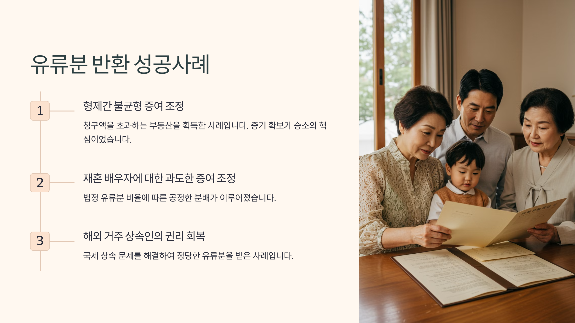 변호사의 역할은 이런 증거들을 법원에 맞게 구성하고, 유류분 침해를 증명하는 논리를 설계하는 데 있었죠. 단순히 '내가 억울하다'는 감정만으로는 절대 승소할 수 없다는 사실을 보여주는 사례예요.