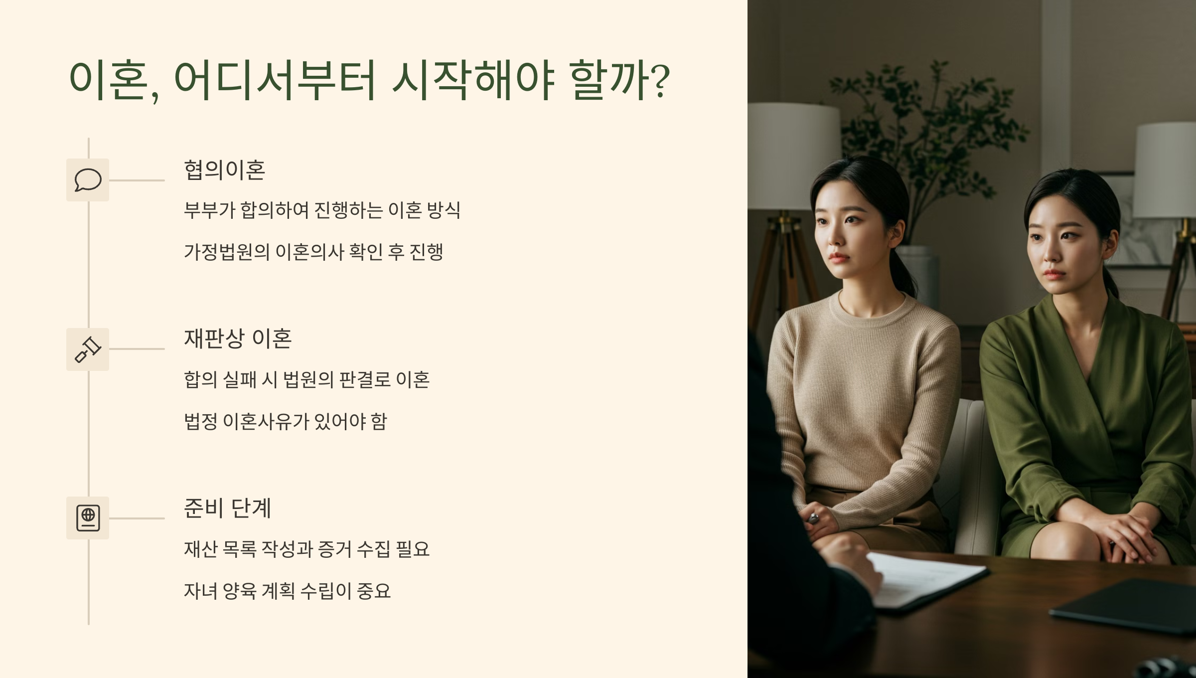 이혼을 결심했다면 가장 먼저 해야 할 일은 ‘이혼 방식’을 선택하는 거예요. 크게는 협의이혼과 재판이혼으로 나뉘어요. 둘 다 법적으로 인정받는 방식이지만, 절차나 시간, 비용, 스트레스 면에서 큰 차이가 있죠.
