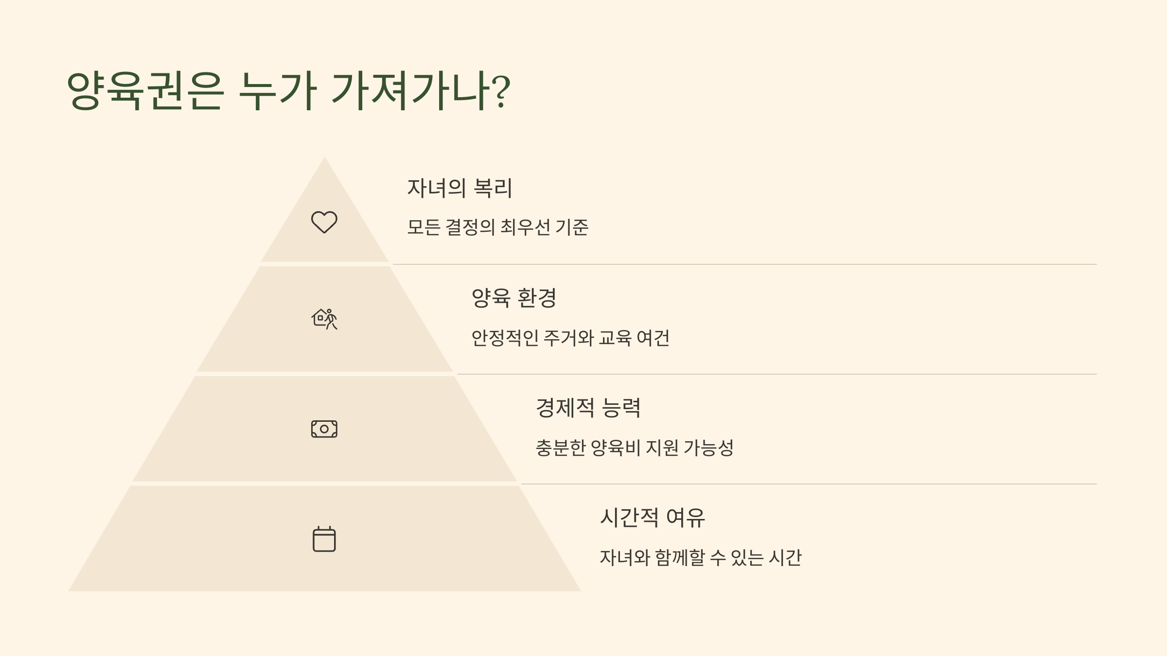 양육권은 단순히 감정의 문제가 아니라, 부모의 직업, 수입, 주거환경, 자녀의 나이, 정서적 관계 등 다양한 요소가 복합적으로 작용해요. 특히 학령기 자녀가 있는 경우엔 학교와의 거리, 친구 관계까지도 고려되기도 해요.