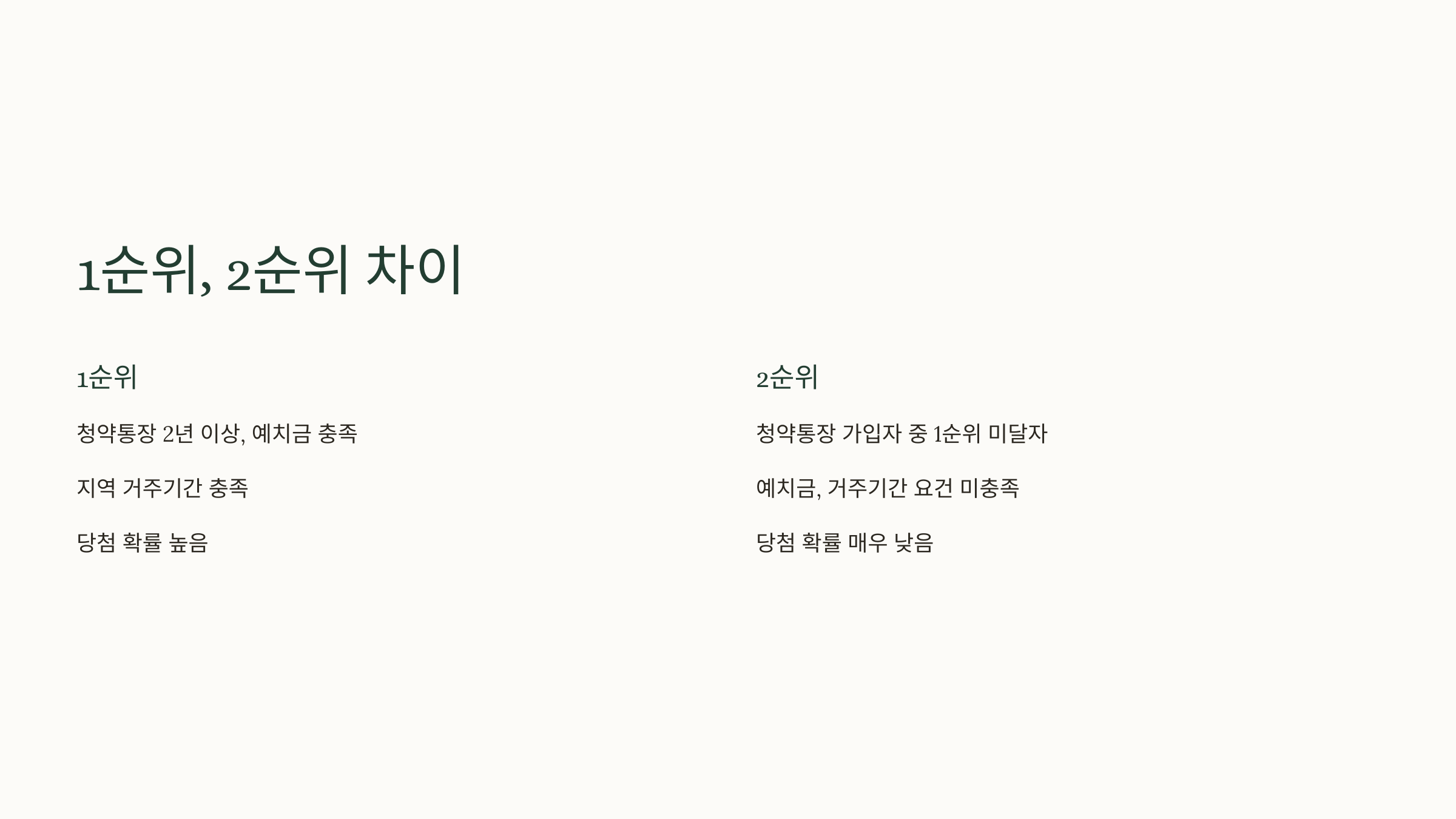 주택청약은 1순위와 2순위로 나뉘어요. 경쟁이 심한 인기 지역에서는 1순위에서 마감되기 때문에 2순위는 거의 당첨이 어려워요. 😢