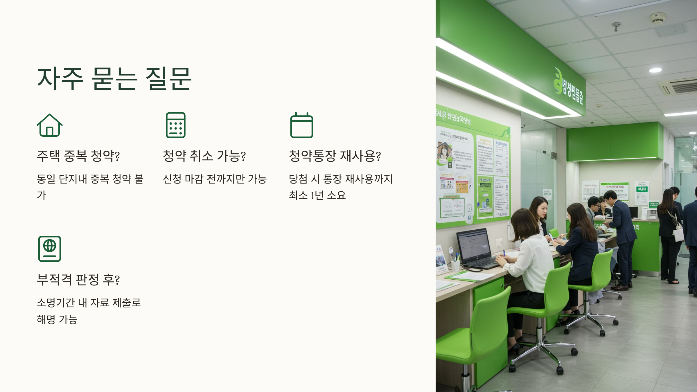 A7. 특별공급(신혼부부, 다자녀 등) 일부는 청약통장 없이도 가능하지만, 일반 청약은 불가능해요.