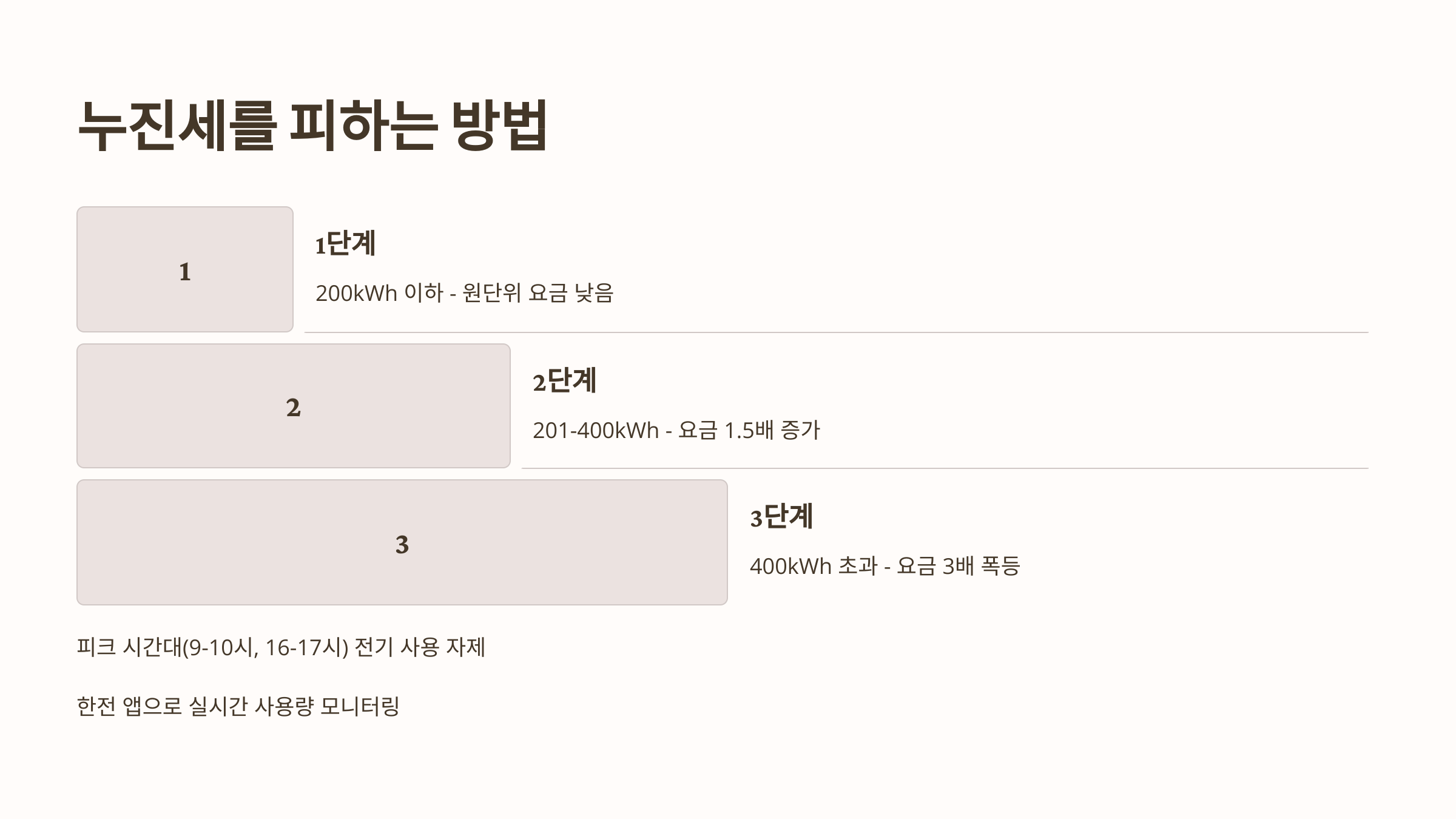 이처럼 전력 사용량이 많아질수록 요금이 기하급수적으로 오르기 때문에, 평소 전기 사용을 줄이는 습관이 중요하답니다. 😊