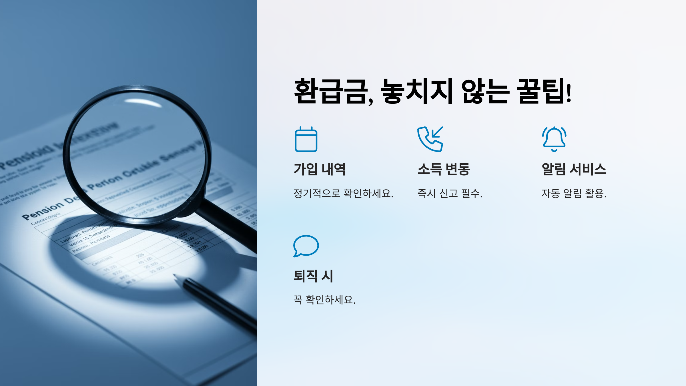 국민연금 환급금을 받지 못하고 지나치는 경우가 많아요. 아래 팁을 참고하면 환급금을 놓치지 않고 받을 수 있어요! 😊