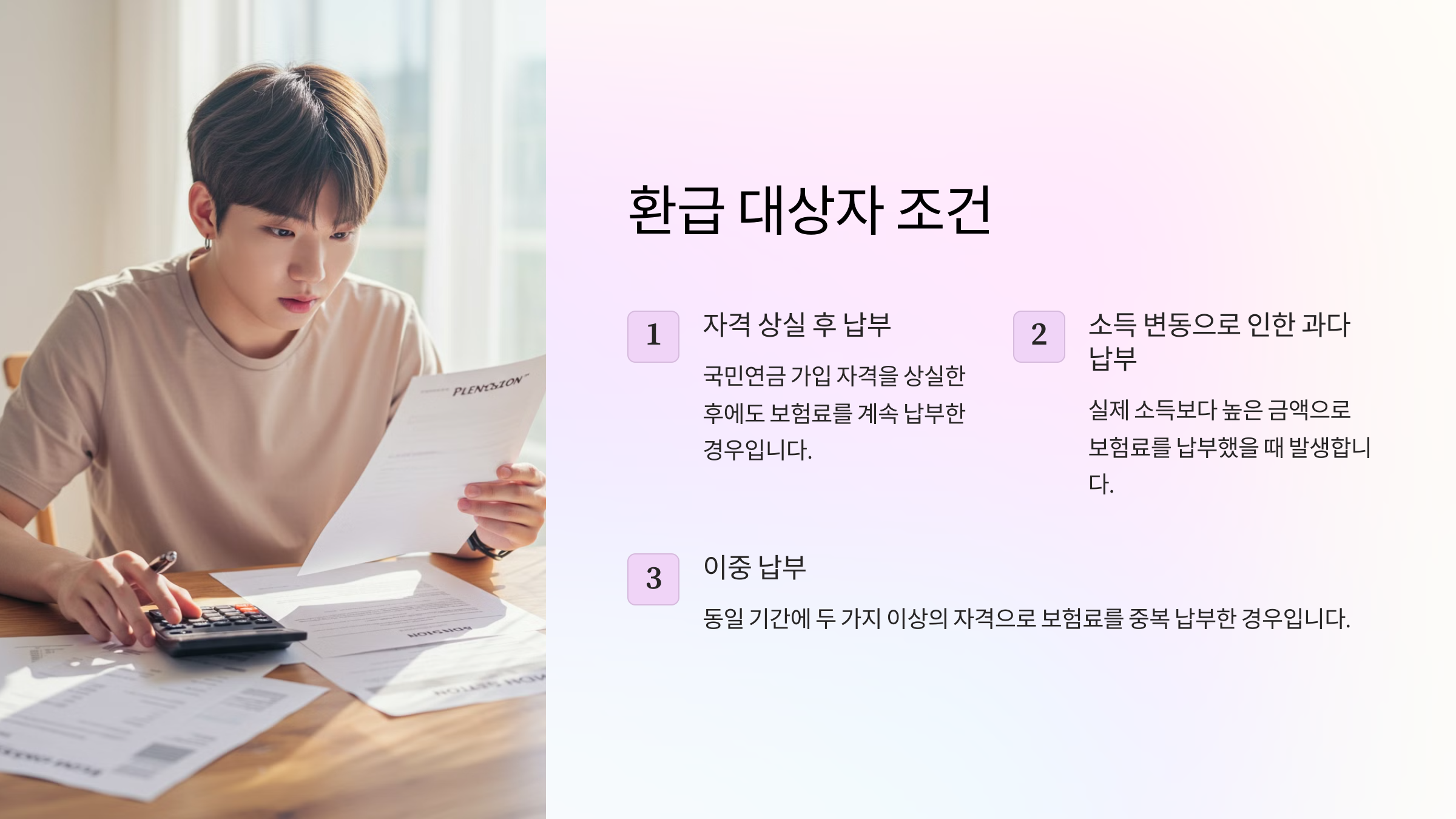📌 먼저, 과오납금 환급 대상자는 국민연금을 납부하다가 실수로 초과 납부한 경우 해당돼요. 예를 들어, 사업장에서 이중 납부했거나 자동이체 오류로 과납된 경우 환급 대상이 돼요.