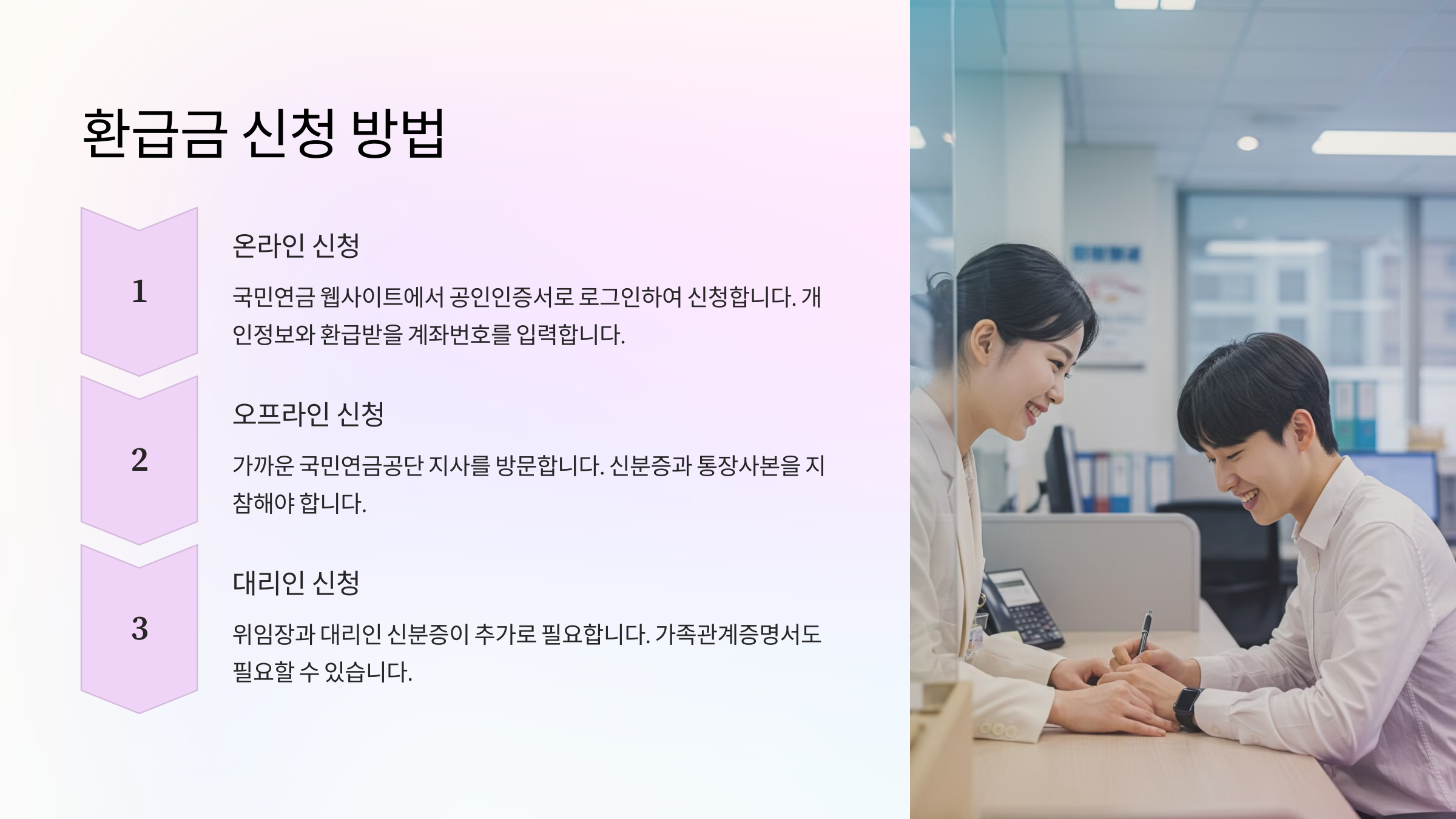 환급금 조회 후 받을 금액이 있다면 신청을 해야 실제로 돌려받을 수 있어요. 국민연금 환급금은 온라인 또는 방문 신청이 가능해요.
