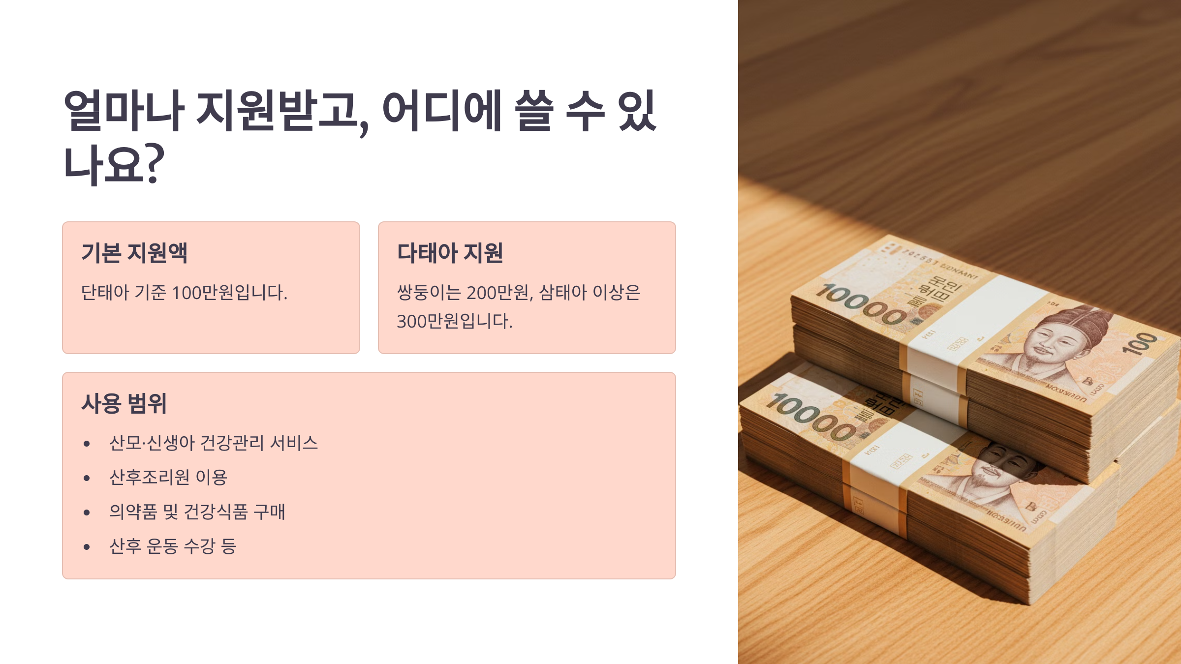 이 지원금은 산후조리원 이용, 건강관리 서비스, 육아 용품 구입 등에 사용할 수 있어요. 단, 현금으로 지급되지 않는 경우가 많기 때문에 반드시 사용 가능한 항목을 확인해야 해요.