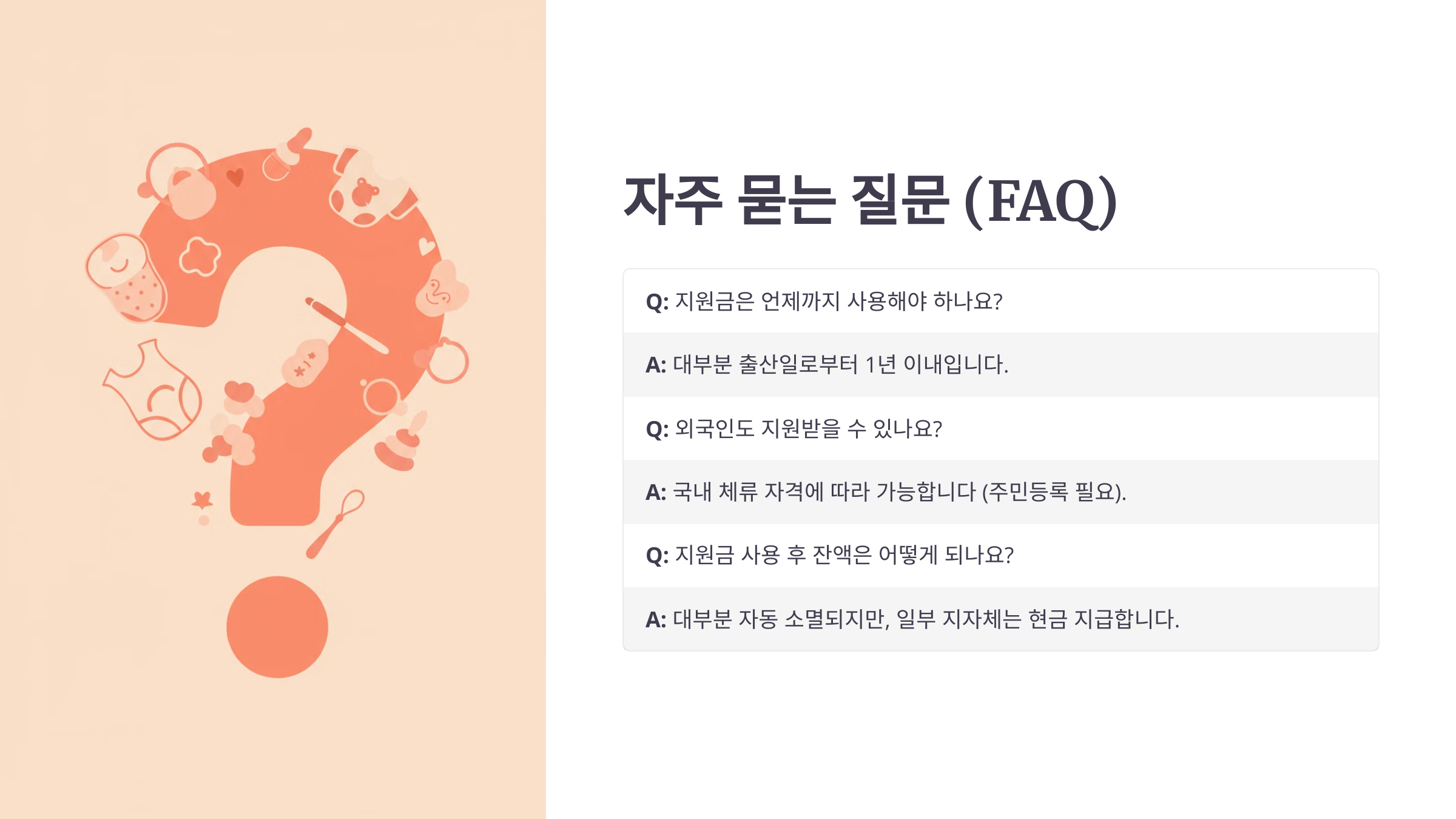 이제 산후조리 지원금과 관련한 자주 묻는 질문(FAQ)을 살펴볼까요? 😊
