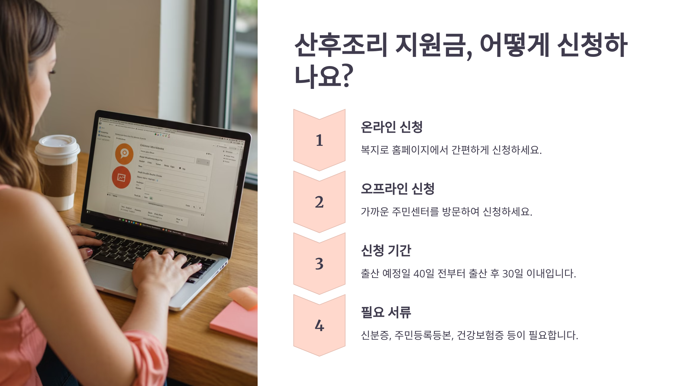 산후조리 지원금 신청은 어렵지 않아요! 😊 출산 후 빠르게 신청하면 더 빨리 지원금을 받을 수 있으니 절차를 잘 확인해 보세요.