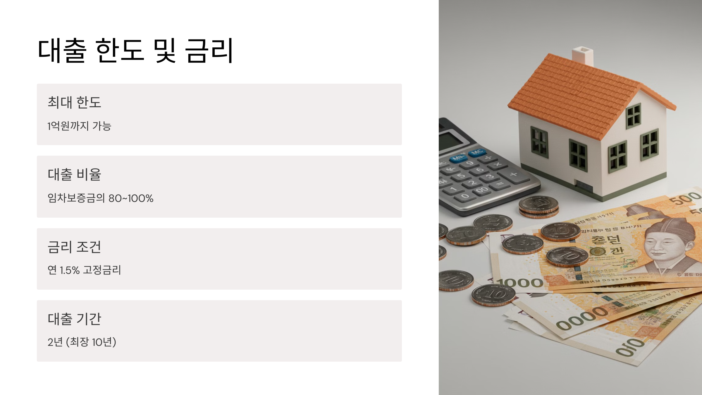 ✔ 대출 한도: 최대 1억 원 (전세보증금의 100%까지 가능)
