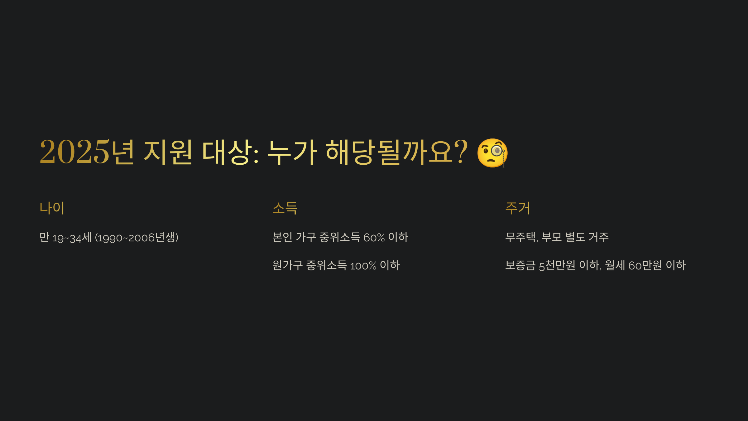 기본적으로 만 19세부터 34세까지의 청년들이 신청할 수 있으며, 소득과 재산 기준을 충족해야 해요. 단, 기초생활보장 수급자나 다른 주거급여를 받는 경우 중복 지원이 불가능할 수 있으니 반드시 확인해야 해요!