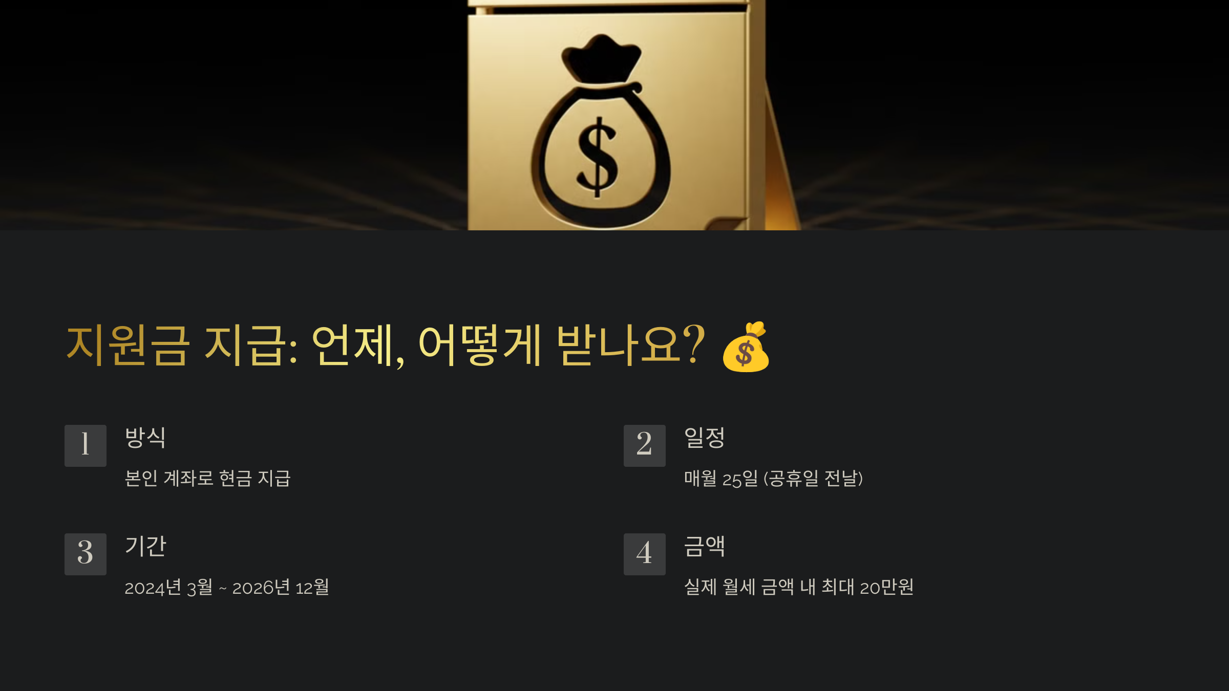 지원금은 신청 후 심사를 거쳐 1~2개월 후부터 지급되며, 보통 신청한 계좌로 자동 입금돼요. 하지만 지원 대상자로 선정되었다고 해서 무조건 12개월 동안 지원받는 것은 아니며, 중간 심사를 통해 자격이 유지되는지 확인해요. 📋