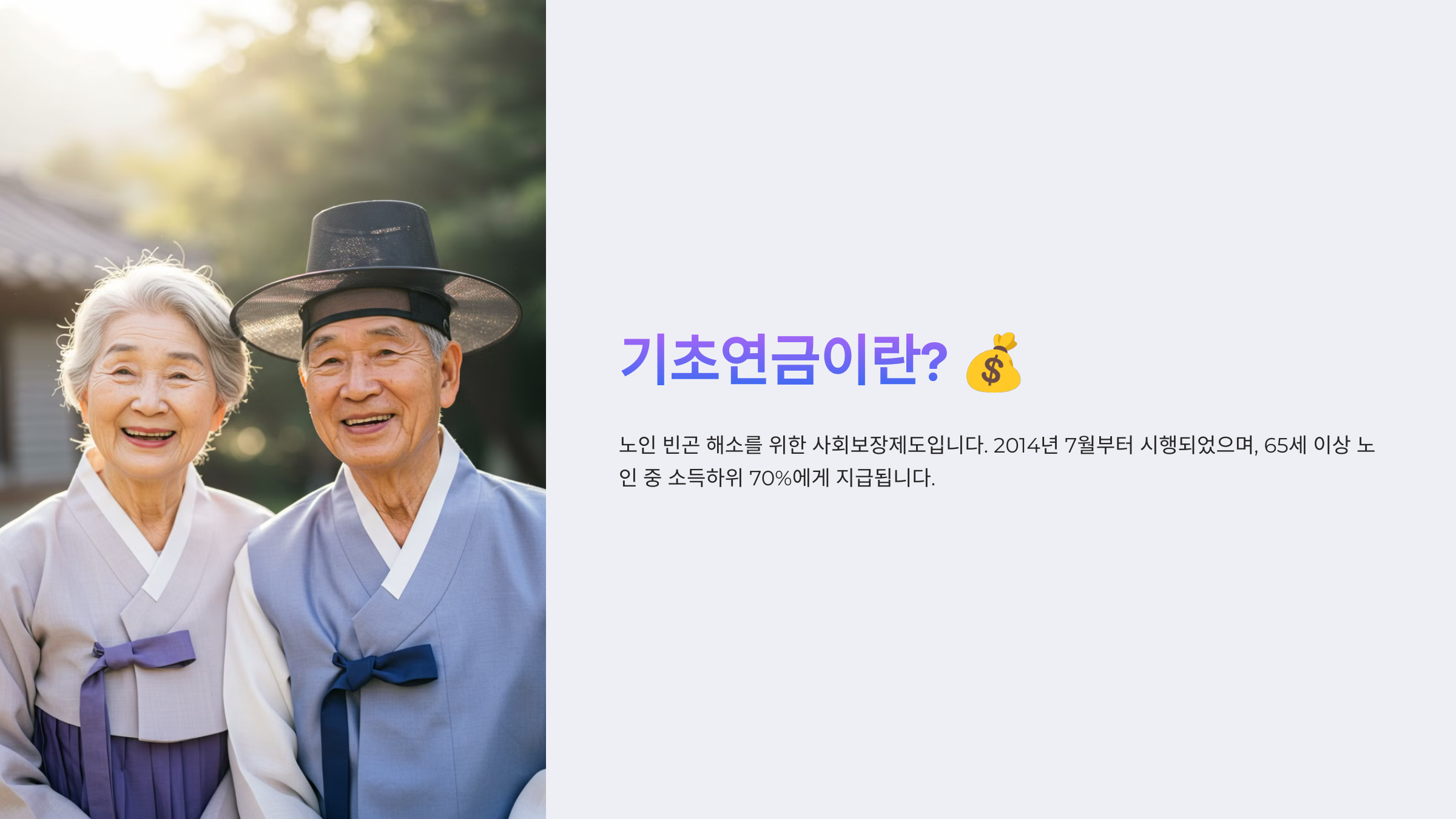 기초연금은 대한민국 정부가 65세 이상 어르신들의 생활 안정을 위해 지원하는 복지제도예요. 경제적 부담을 덜어주기 위해 일정 소득 이하인 분들에게 지급되죠. 💵