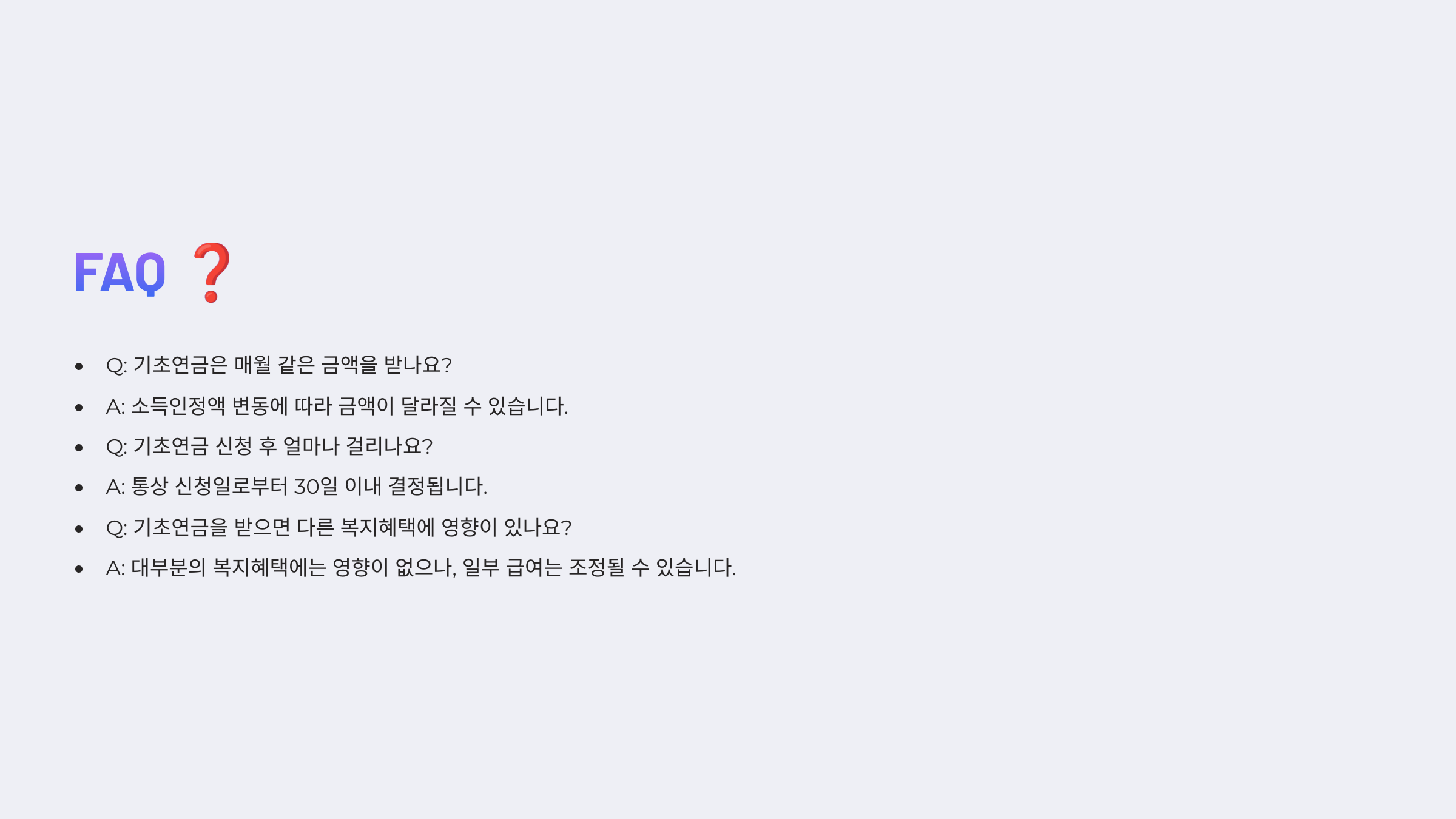 이제 기초연금에 대한 궁금증이 해결되었나요? 😊 기초연금은 어르신들의 소중한 권리이므로 꼭 신청해서 혜택을 누리시길 바라요!