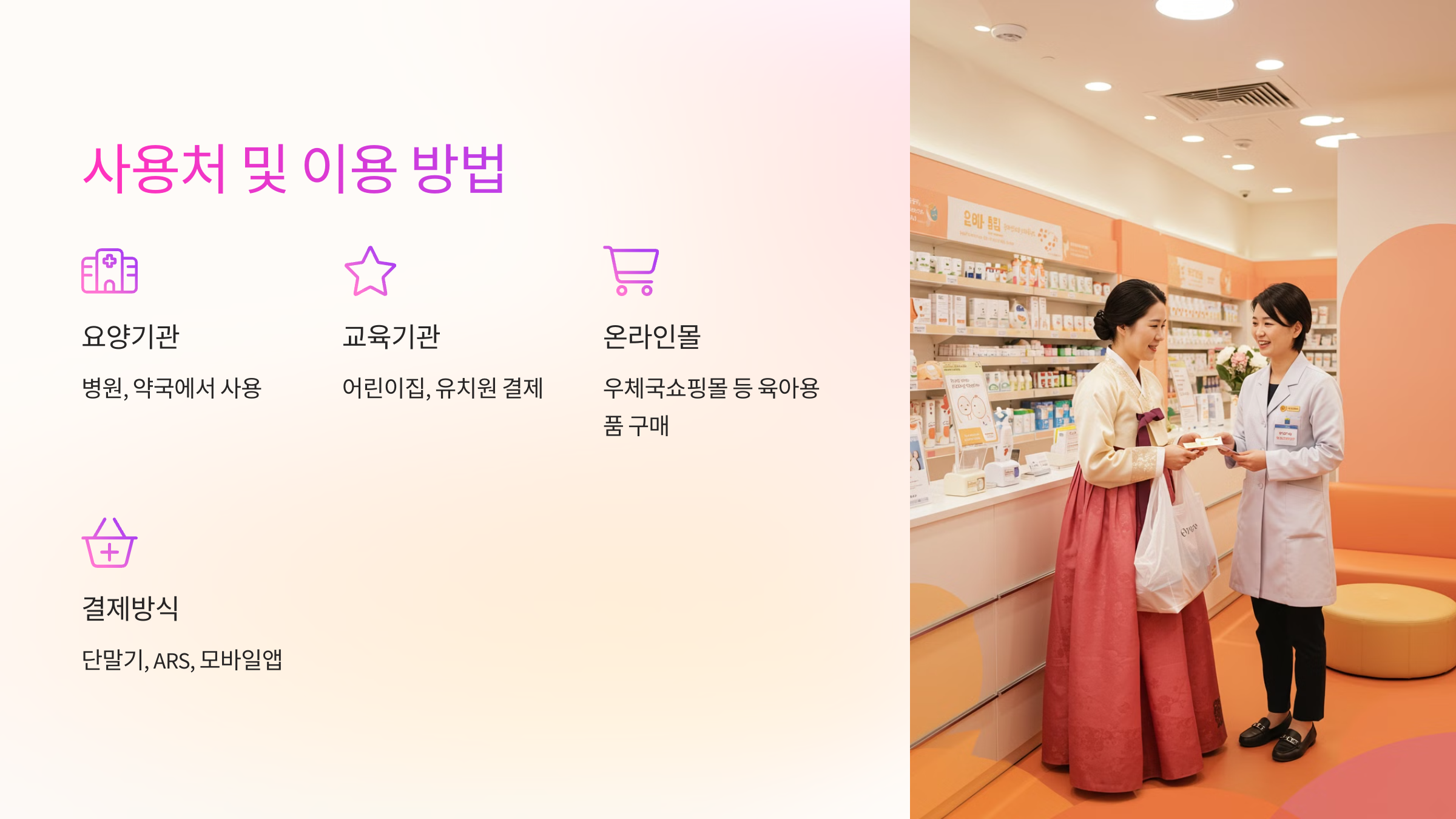 | 아동 지원 | 보육료, 유아학비, 아동수당 결제 가능 |