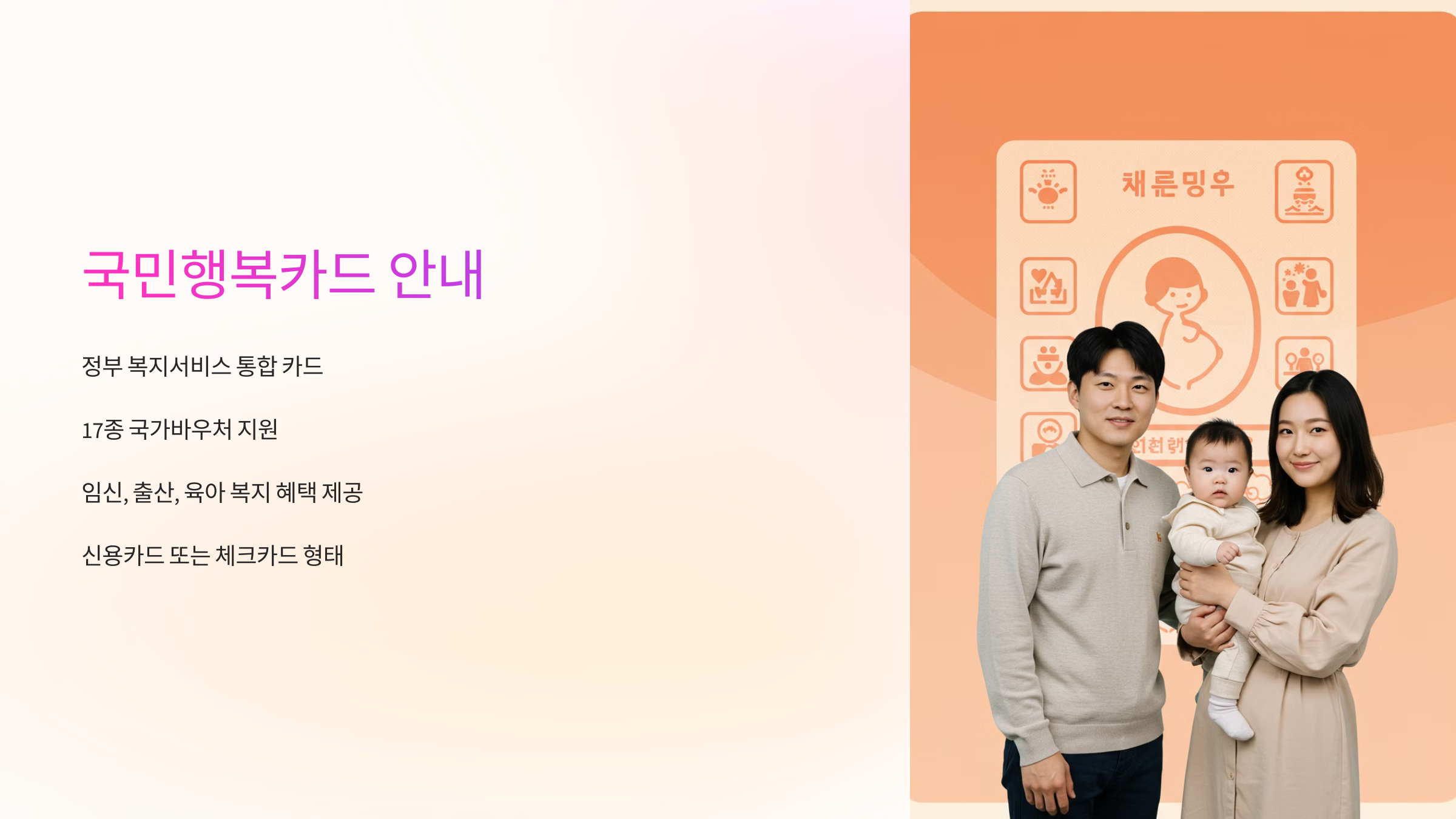 국민행복카드는 정부에서 제공하는 다양한 복지 바우처를 하나의 카드로 통합하여 사용할 수 있도록 한 복지카드예요. 쉽게 말해, 임신·출산 지원부터 아동, 장애인, 노인 복지 혜택까지 한 장의 카드로 받을 수 있는 것이죠! 🎉