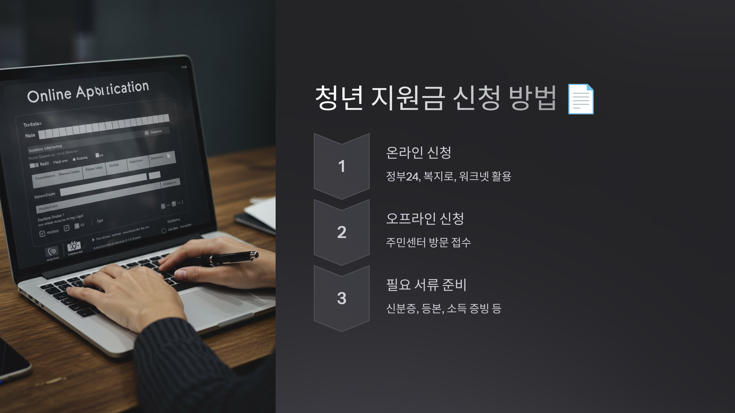 청년 지원금을 받으려면 신청 절차를 잘 알아두는 게 중요해요! 대부분의 지원금은 온라인으로 신청할 수 있어서 간편하게 진행할 수 있어요. 😊