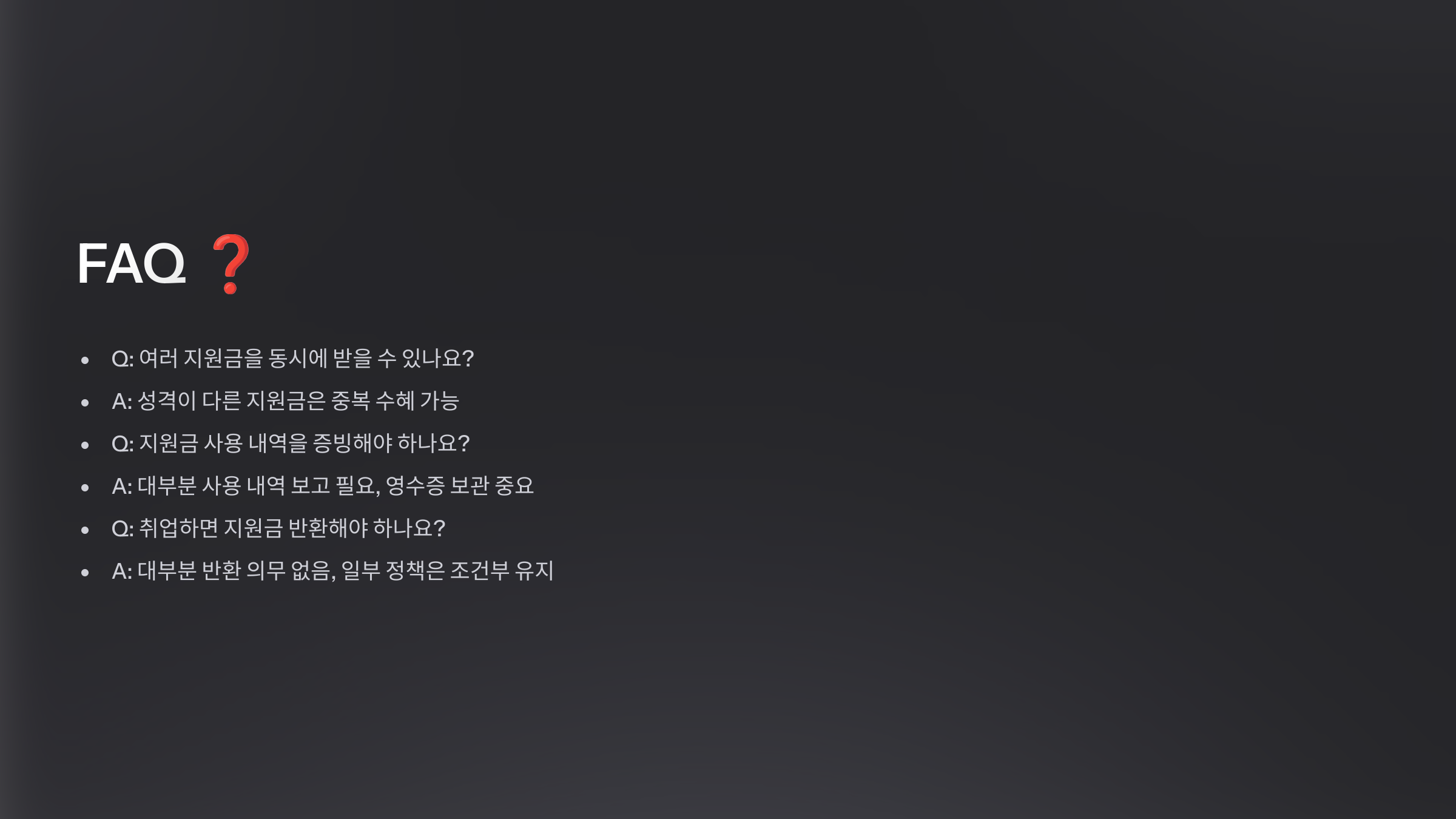 A1. 네! 일부 지원금은 중복 신청이 가능해요. 예를 들어, 청년 구직 지원금과 청년 월세 지원금은 동시에 받을 수 있어요. 하지만 같은 유형의 지원금(예: 두 개의 월세 지원금)은 중복 신청이 불가능한 경우가 많으니 꼭 확인하세요. 🔎