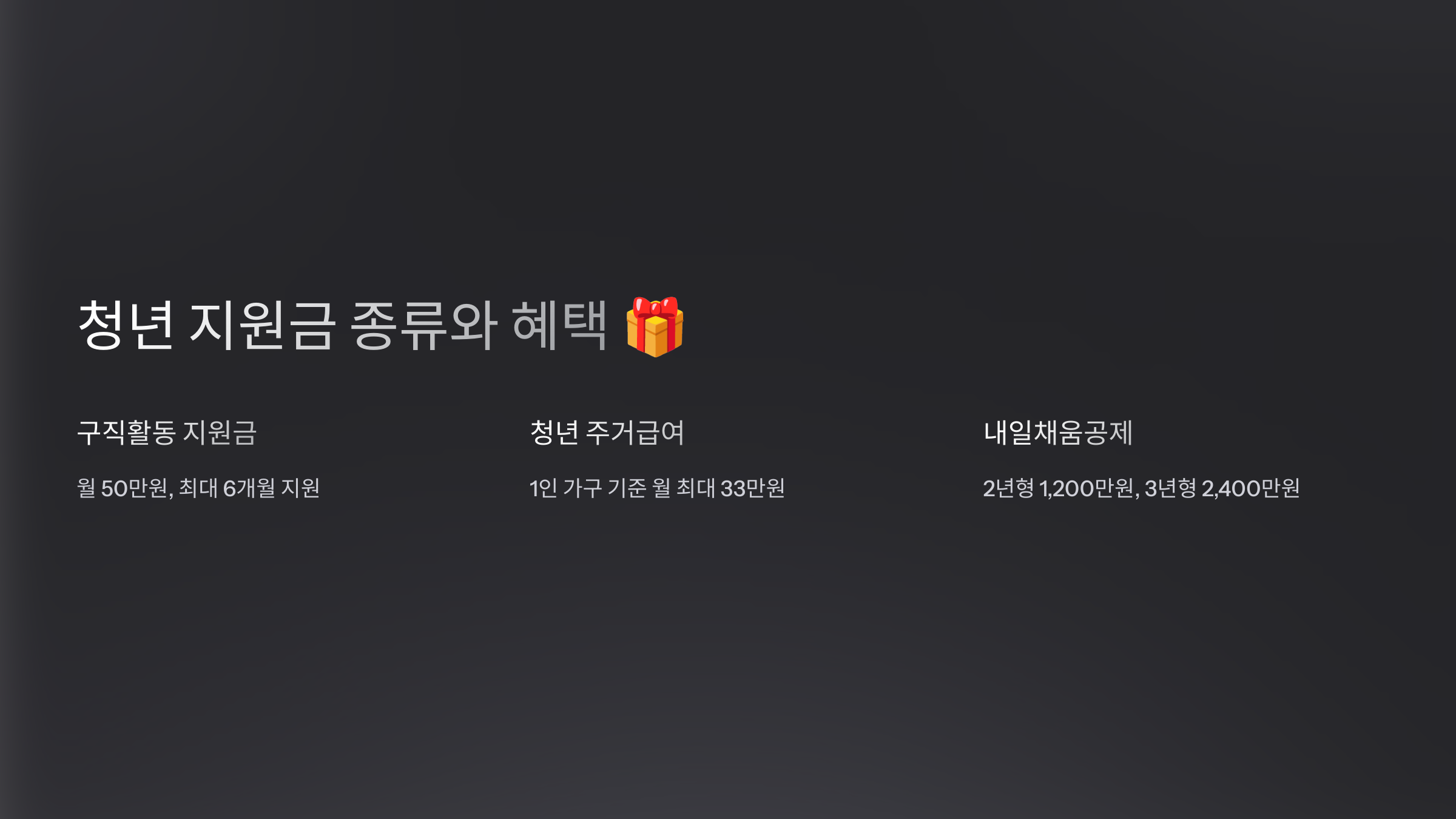 | 💻 맞춤형 지원 검색 | ‘청년정책 종합정보’ 사이트(youth.go.kr)에서 본인에게 맞는 지원금을 찾아보세요. |