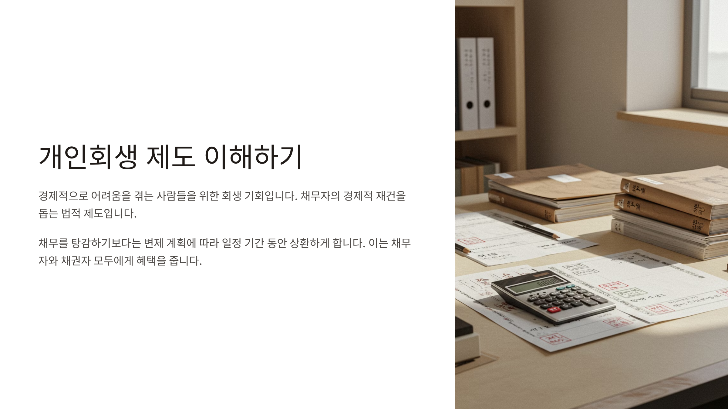 개인회생은 과도한 채무로 인해 정상적인 생활이 어려운 사람들에게 일정 기간 동안 일정한 금액을 갚고 나머지 채무를 면제받을 수 있도록 돕는 법적 제도예요. 2004년부터 시행되어 많은 분들의 경제적 회복에 기여하고 있답니다. 이 제도는 파산보다는 좀 더 부드러운 방식으로 채무를 조정해 주기 때문에 자산을 유지한 채 새롭게 출발할 수 있는 길을 열어줘요.
