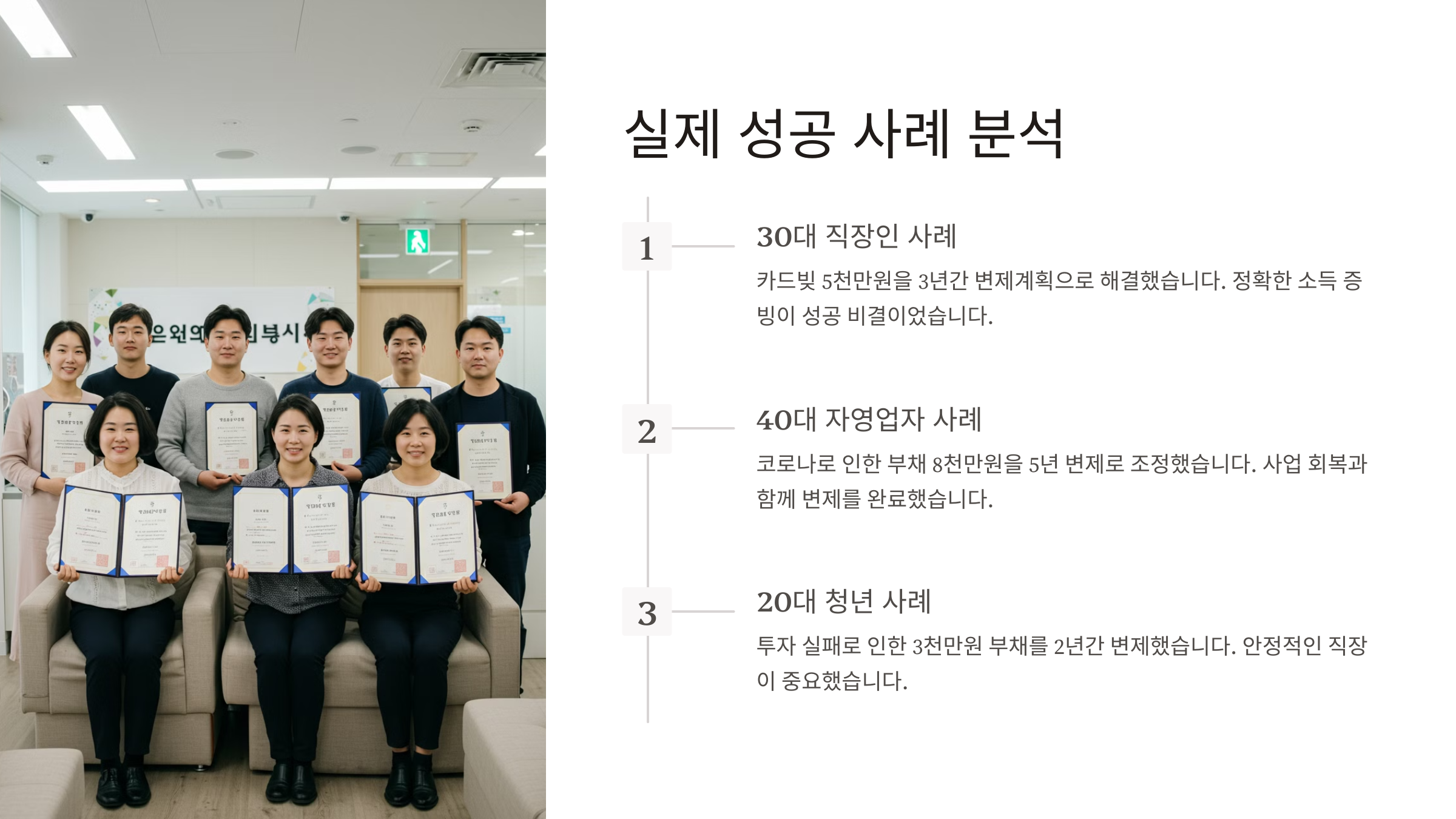 개인회생 제도를 통해 빚에서 벗어난 실제 사례들을 보면 공통적으로 몇 가지 핵심 전략을 잘 사용했더라고요. 이 사례들을 참고하면 나도 충분히 가능하다는 용기를 얻을 수 있어요. 지금부터 다양한 상황의 성공 스토리를 소개해볼게요.