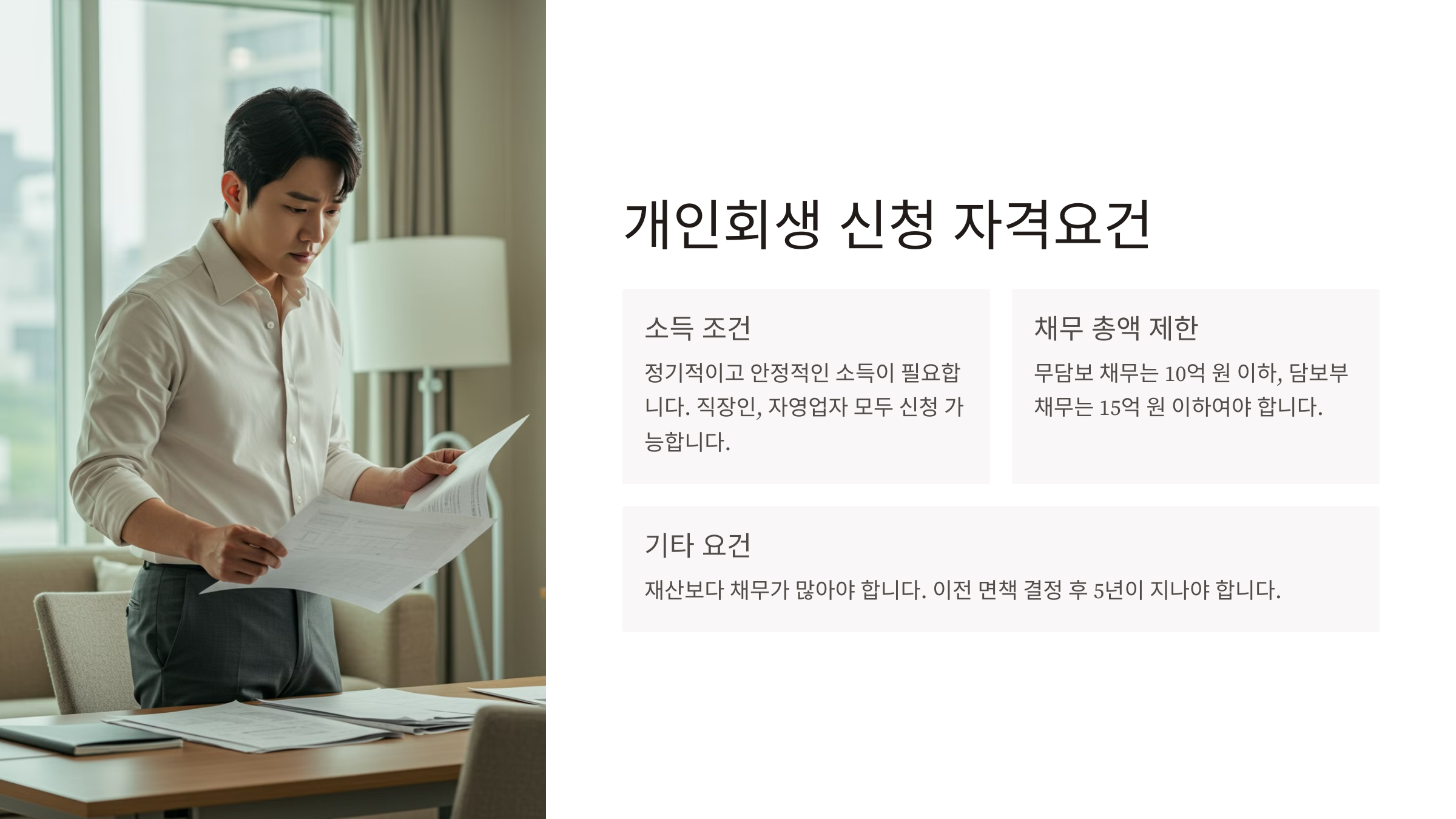 개인회생을 신청하려면 단순히 빚이 많다고 해서 누구나 가능한 건 아니에요. 법원에서 요구하는 몇 가지 기준을 반드시 충족해야 해요. 이 기준은 개인회생 제도의 근본적인 목적에 맞춰 설정된 것으로, "채무자가 경제적으로 회복 가능성 있는 사람인지"를 판단하는 데 초점이 맞춰져 있어요.