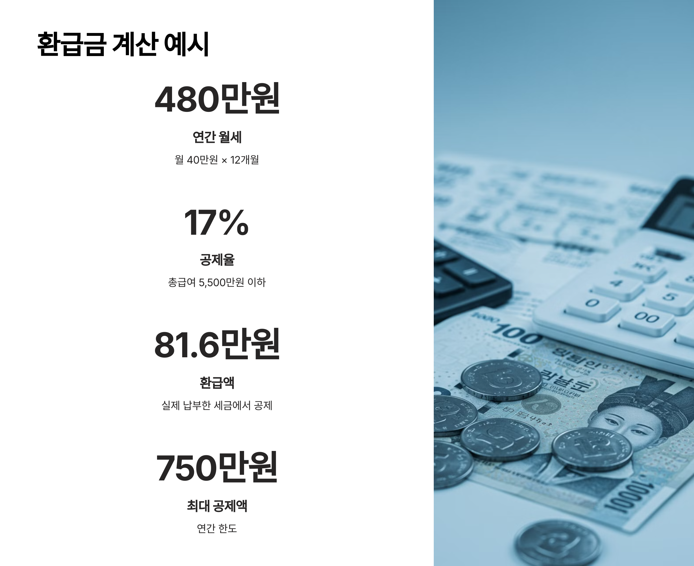 예를 들어 월세가 월 50만 원이고 연간 600만 원을 지불했다면, 공제 대상 한도(750만 원 이하) 안에 들어가요. 이 중 10~12% 정도를 세액공제로 받을 수 있으니 약 60만 원~72만 원 정도 환급받을 수 있는 거예요. 단, 정확한 금액은 본인의 소득세율에 따라 조금씩 달라질 수 있어요.