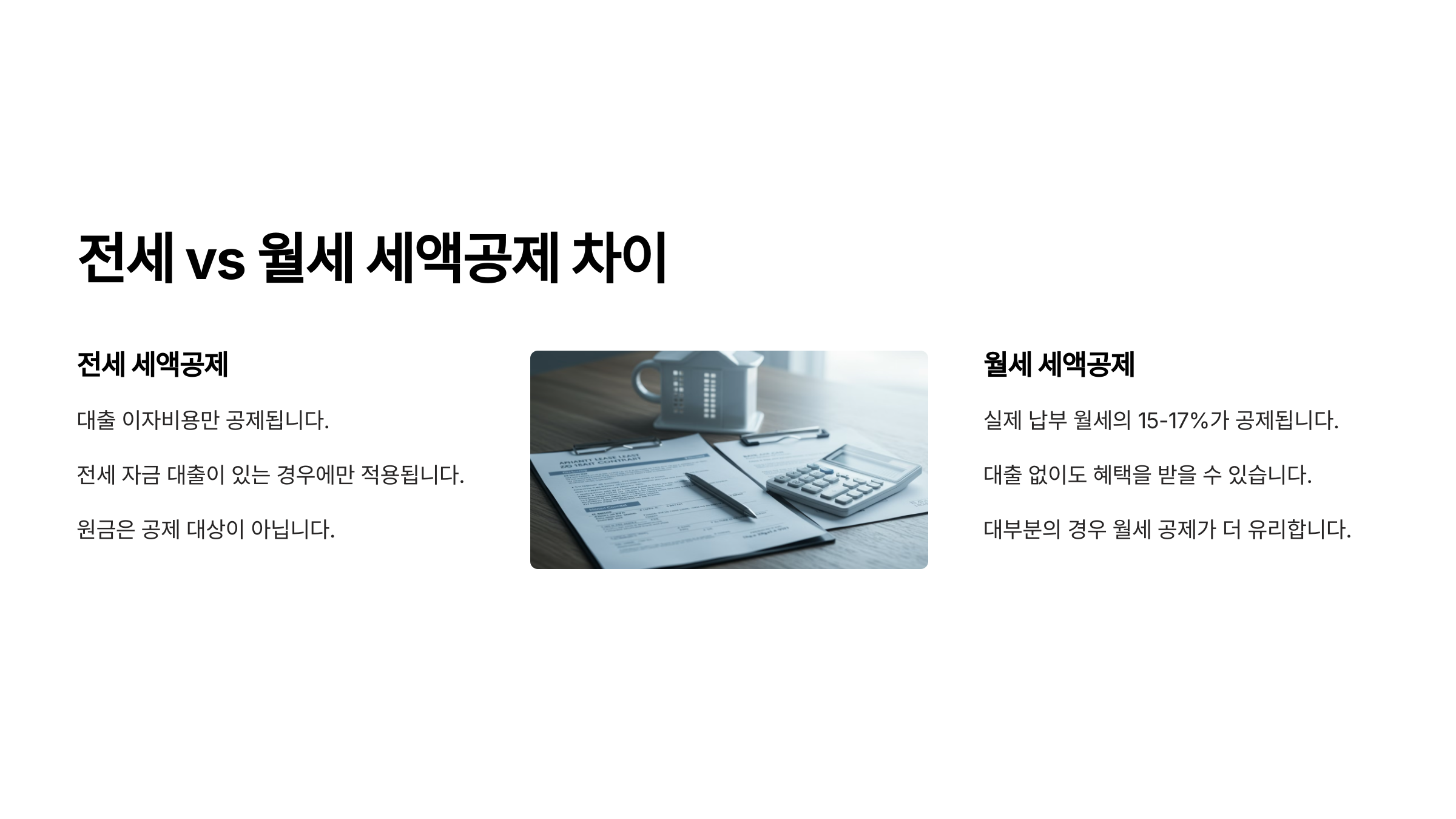 많은 분들이 헷갈려하는 부분! “전세도 세액공제 되나요?”라는 질문을 정말 자주 받아요. 결론부터 말하자면, 전세는 일반적으로 월세 세액공제 대상이 아니에요. 다만, 전세자금 대출 이자에 대해서는 별도로 공제가 가능하답니다.
